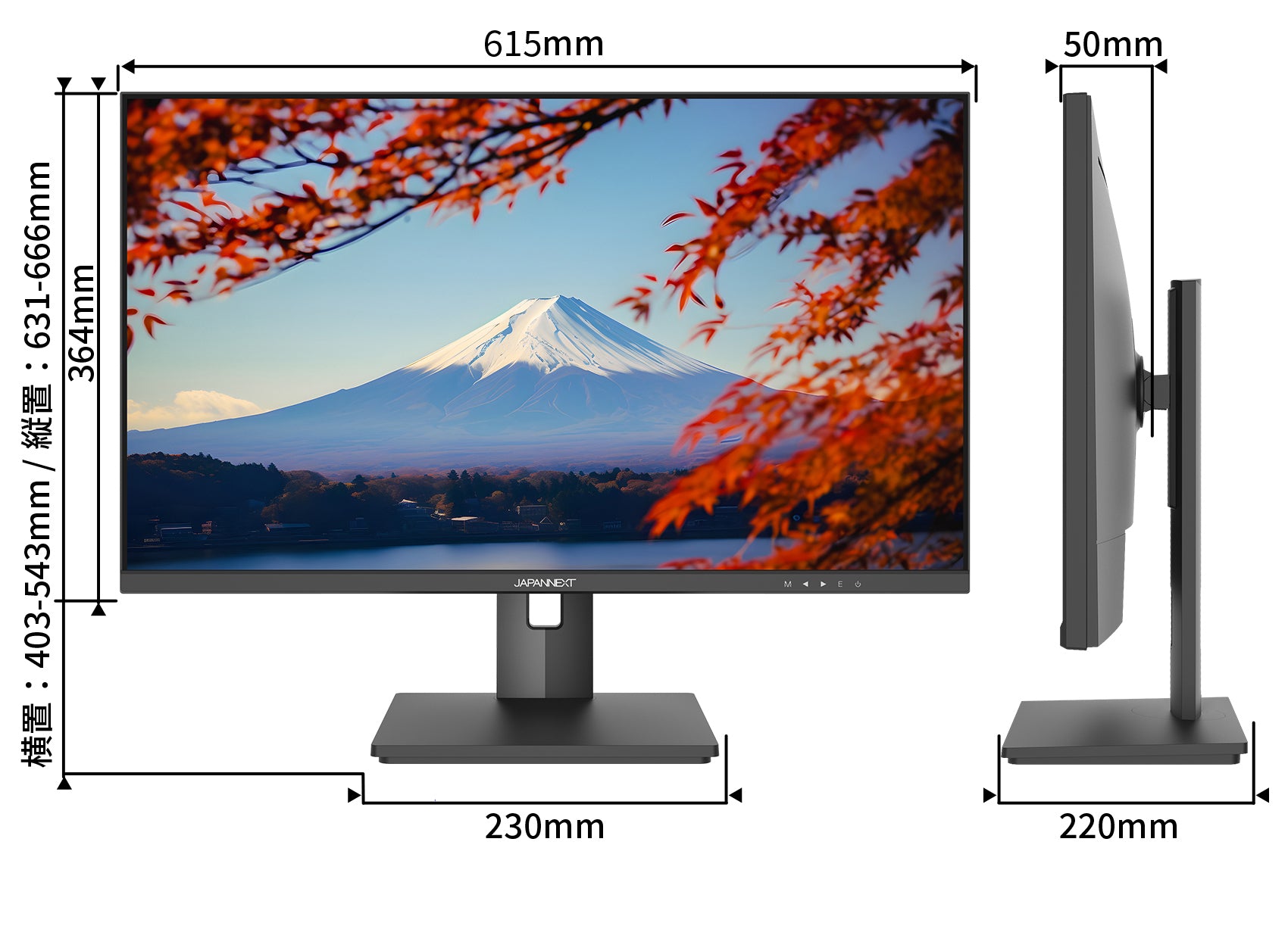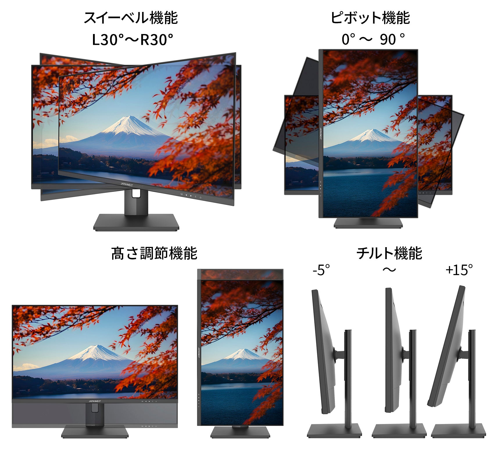 高さ調整が可能な、昇降式スタンドを採用。140mmの範囲でお好みの高さにモニターの高さを調整出来ます。さらにピボット機能を搭載で90度回転させて縦での使用も可能です。