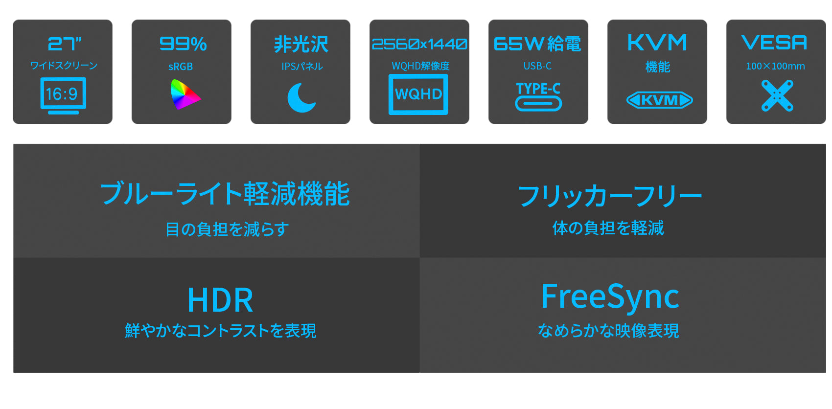 27インチのIPSパネルを採用し、WQHD(2560 x 1440)解像度に対応した液晶モニターです。sRGB 99%の広色域に対応した高解像度液晶はデスクワークだけでなく、写真編集や動画視聴などにも最適です。