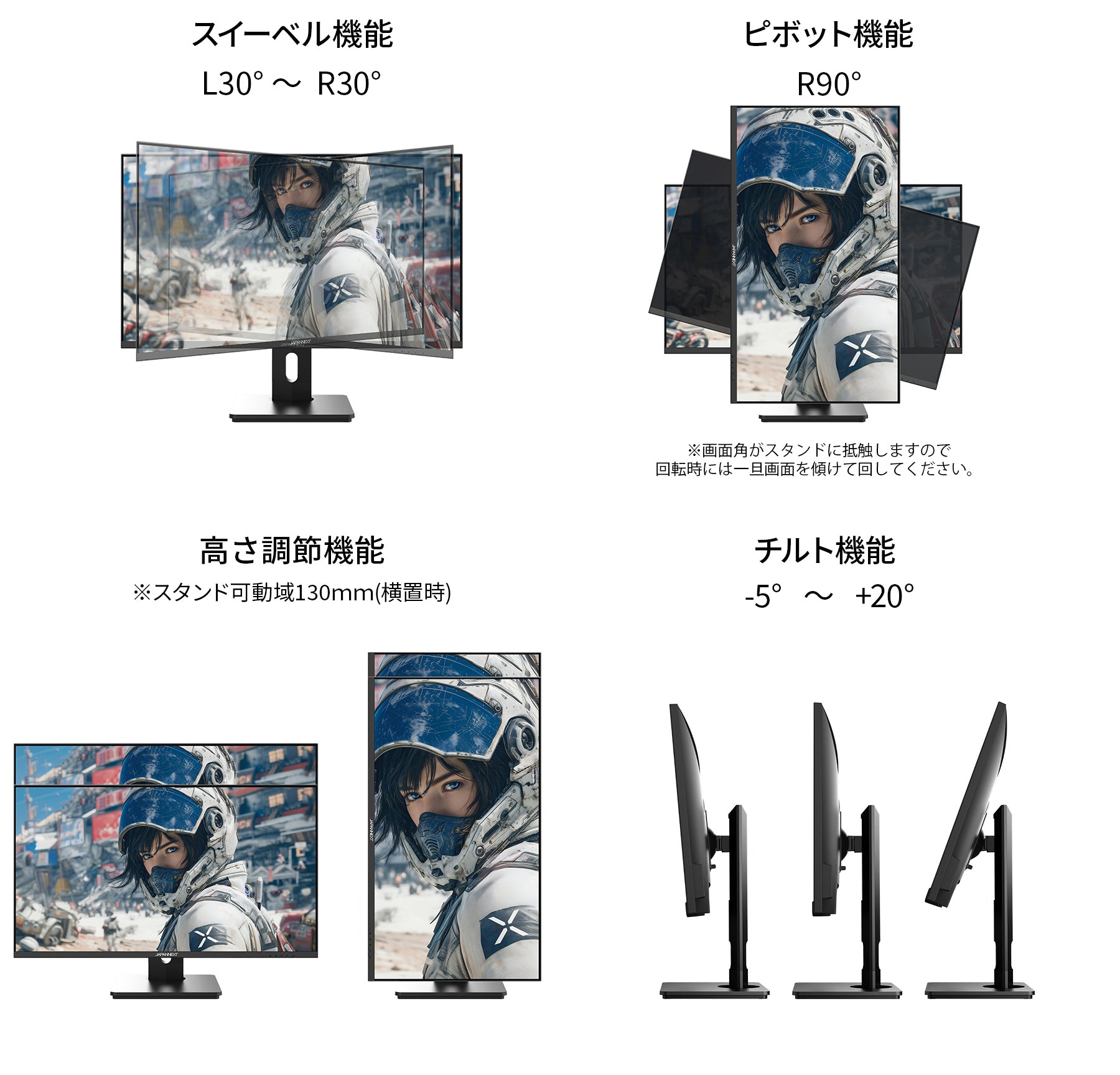 高さ調整が可能な昇降式多機能スタンドを搭載、最大130mmの範囲(横置時)で最適な高さに画面を調整可能です。また、縦画面として使用出来るピボット(回転)機能にも対応します。スイーベル(首振り)機能は、左右各30°の範囲で動かせます。