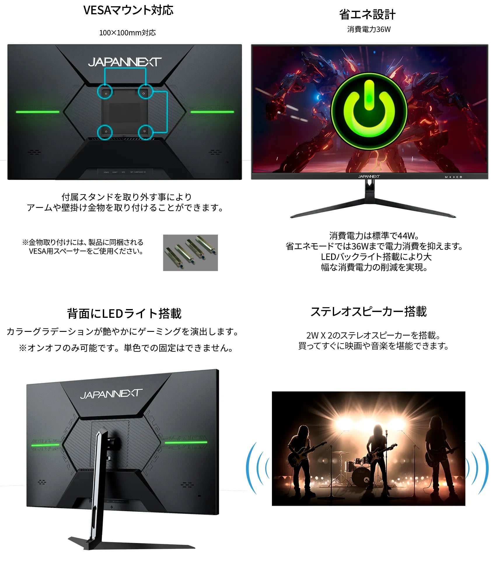 100mmx100mmのVESAマウントに対応。別売のモニターアームなどに取り付けて好きな位置で固定してゲームプレイが可能です。本体背面には鮮やかに光るLEDグラデーションライトを搭載、ゲームプレイを華麗に演出します。