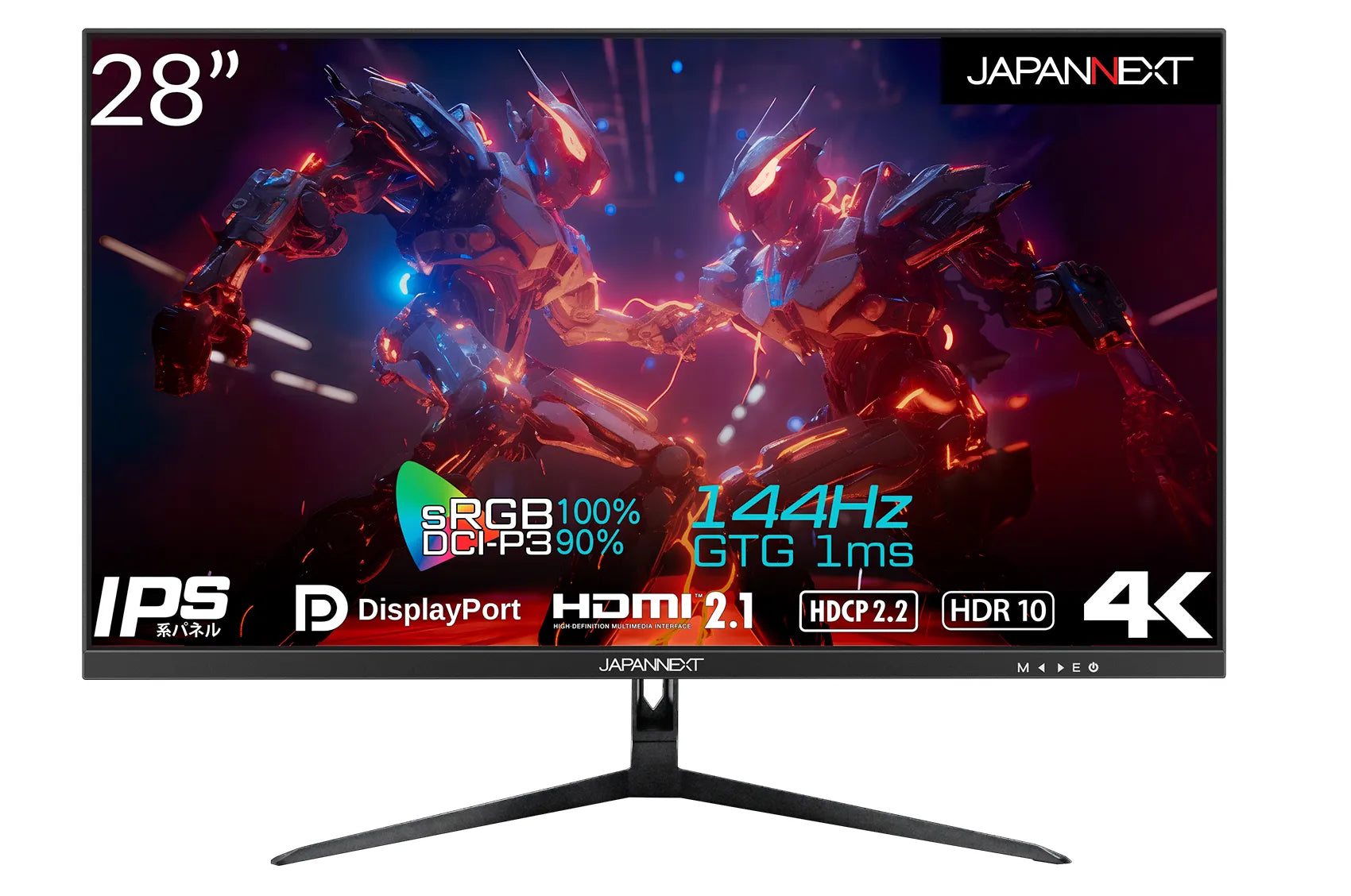 4Kゲーミングモニター「JN-IPS28G144UHDR」はIPS系パネルを搭載、HDMI 2.1 に対応した28インチ 144Hz対応の4Kゲーミングモニターです。HDMI接続にて最大120Hzの高リフレッシュレートを4K解像度で実現しています。DisplayPort は1.4に対応、最大144Hzをサポートし4Kの高精細ゲームをよりなめらかに、低遅延で表示し、FPSなどの動きの速いゲームに最適です。