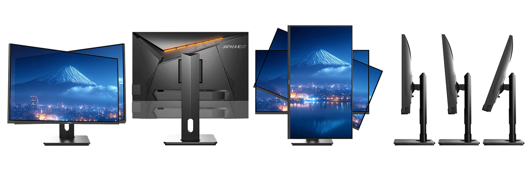 最大110mm(横置時)の範囲で高さ調整が可能な昇降式多機能スタンドを搭載。また、90度右に回転させての縦での使用も可能です。
