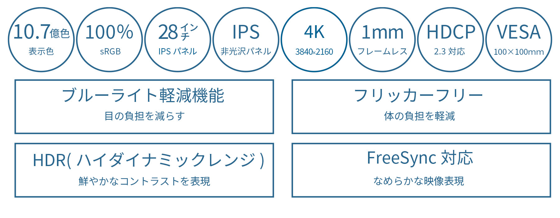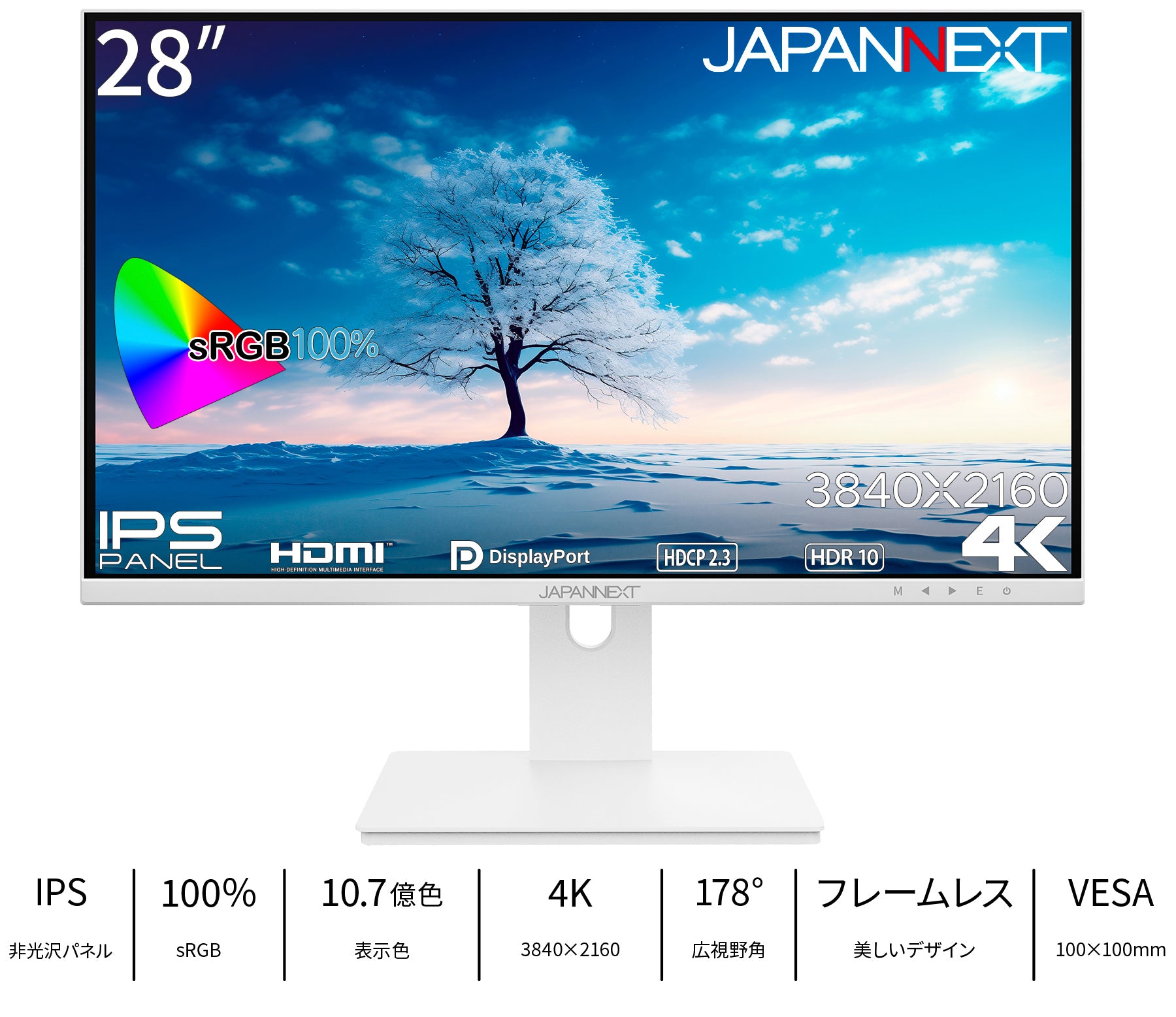 28インチのIPSパネルを搭載、4K(3840 x 2160)解像度に対応した、本体カラーにホワイトを採用した液晶モニターです。フルHD(1920 x 1080)の4倍の高解像度は複数のウィンドウの同時表示を可能にし、圧倒的な高生産性を実現します。あらゆる角度から見ても色やコントラストの変化がおきにくいIPSパネルを搭載し、広視野角上下左右178°を実現します。