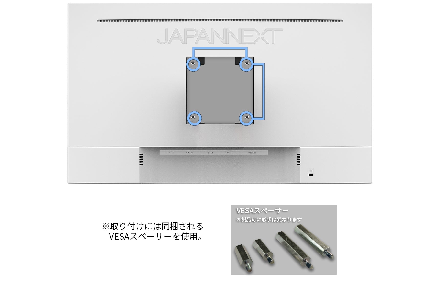 100x100mmのVESAマウントに対応(同梱のVESAスペーサーを使用)しますので、別売りのモニターアームなどに使用が可能です。