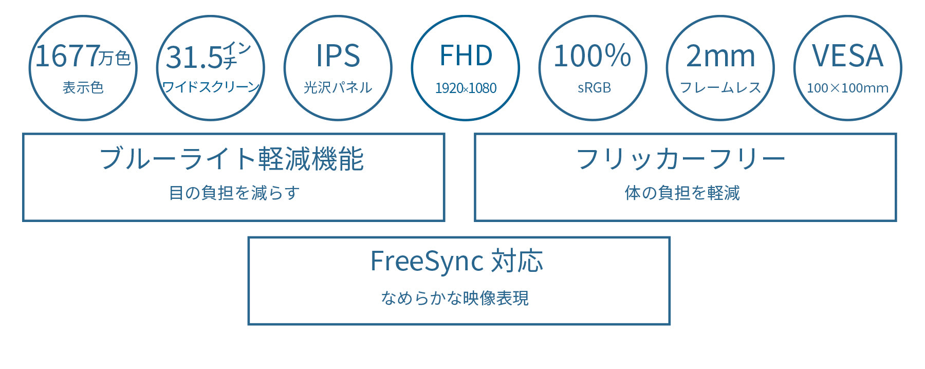 長時間使用時に眼に優しいフリッカーフリー(ちらつき軽減)、ブルーライト軽減モードを搭載します。