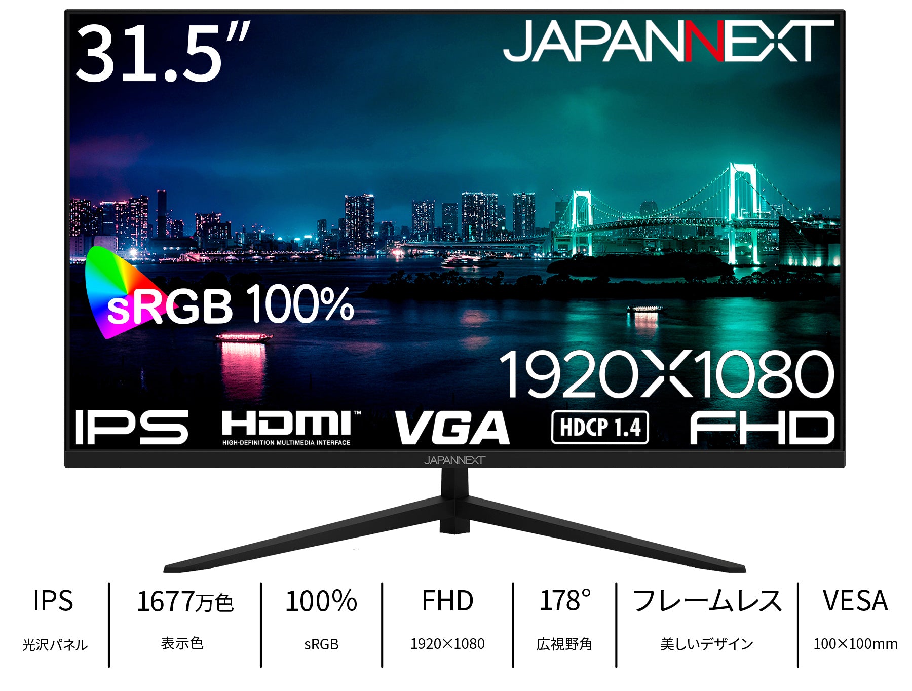 31.5インチのIPSパネルを搭載、使いやすいフルHD(1920x1080)解像度に対応した液晶モニターです。上下左右178度に対応した高画質IPSパネルを搭載し、コンテンツを色鮮やかに映し出します。