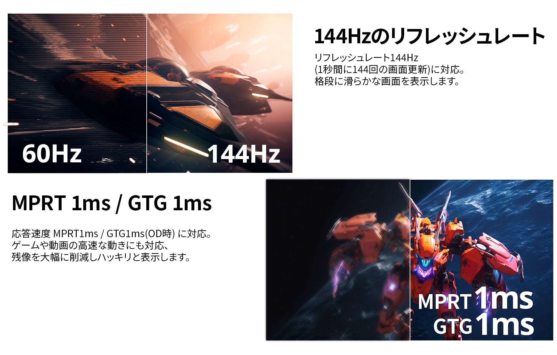 高速リフレッシュレート144Hz、 応答速度/MPRT:1ms GTG:1ms対応