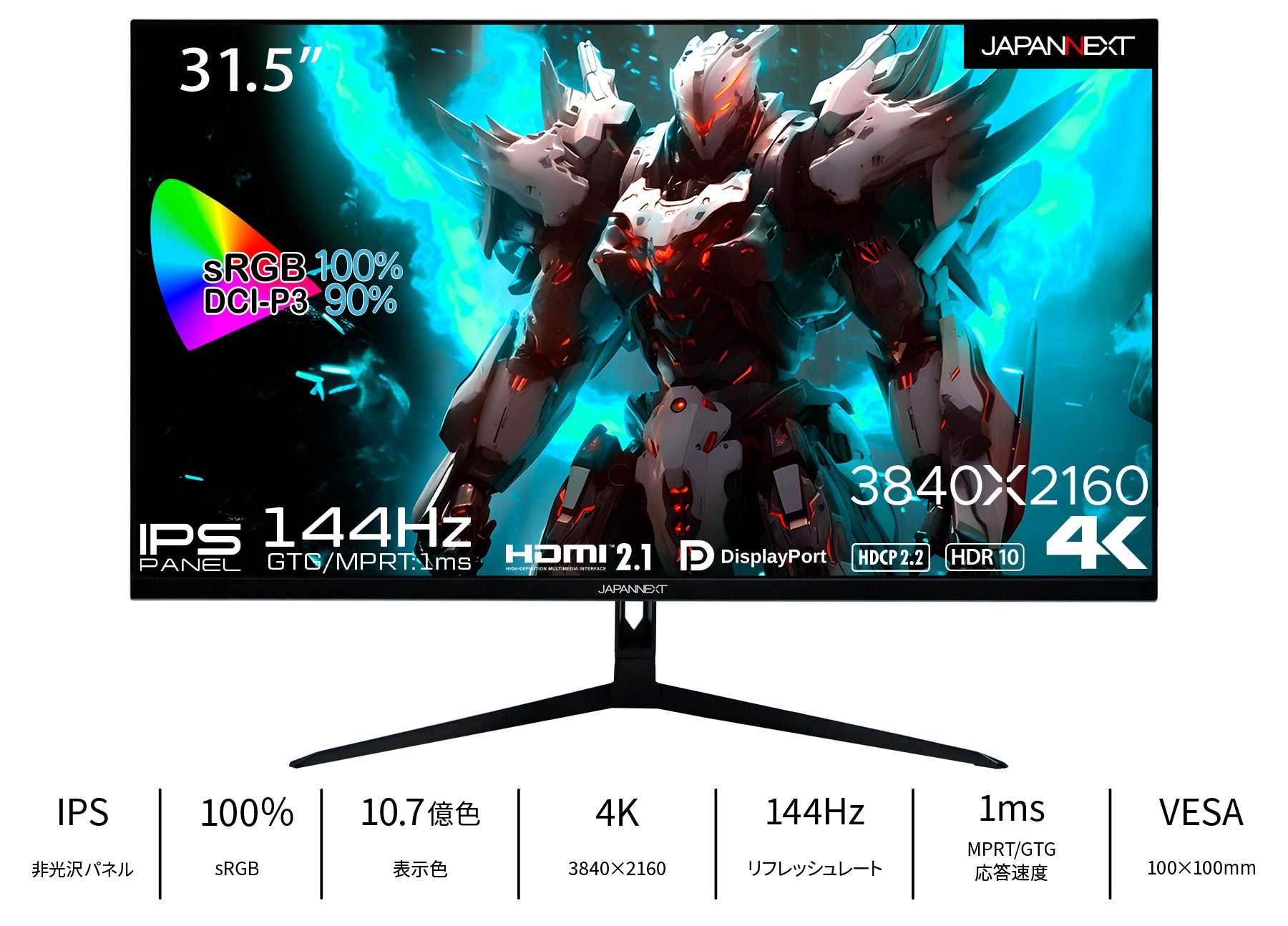 31.5インチのIPSパネルを搭載、最大144Hz(DP接続時)の高リフレッシュレートに対応した4K解像度(3840x2160)の高解像度を誇るゲーム環境に最適なゲーミングモニターです。HDMI 2.1に対応し、HDMI接続時には4K解像度で120Hzの高リフレッシュレートを実現しています。