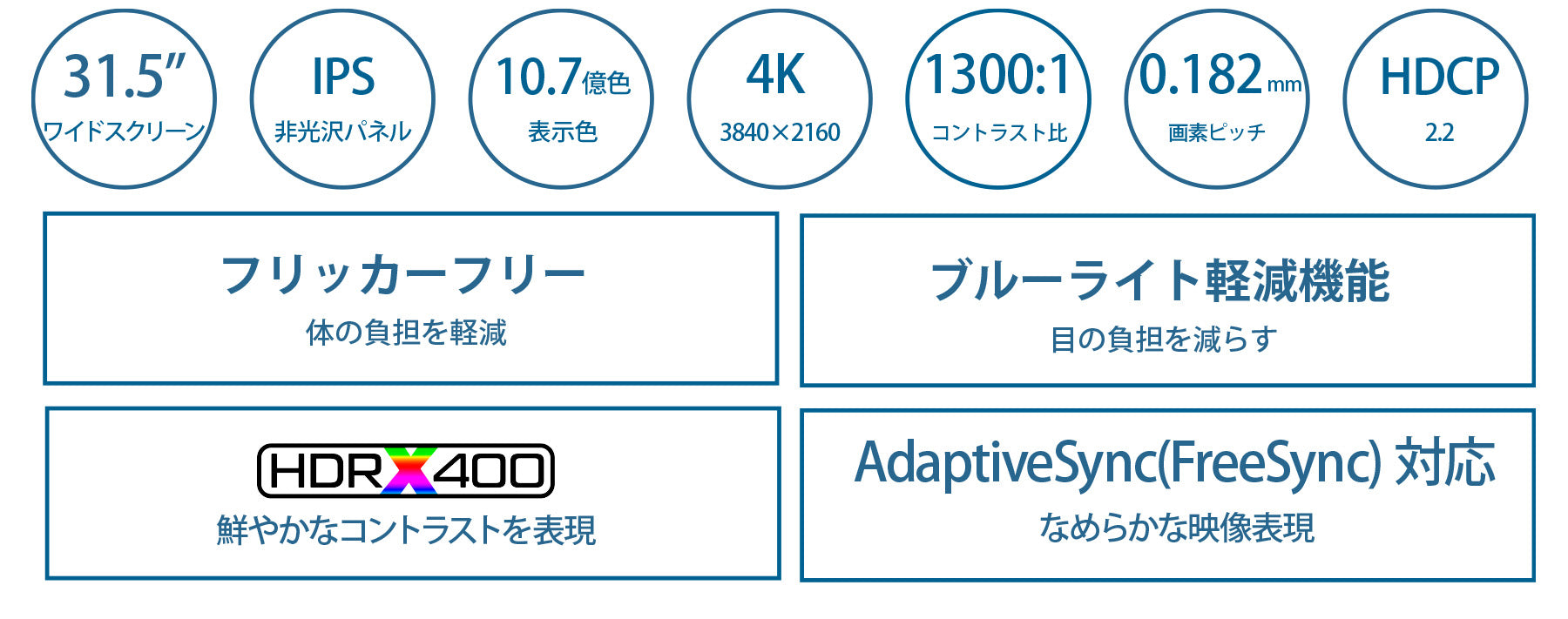 31.5インチのIPSパネルを搭載した、4K(3840x2160)解像度の液晶モニターです。4KはフルHD(1920×1080)解像度の約4倍の作業領域を実現する3840×2160ドットの解像度となり、高精細な表示を実現できます。