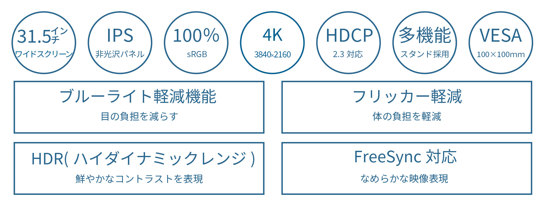 31.5インチのIPSパネルを採用した4K(3840x2160)解像度の液晶モニターです。4KはフルHD(1920×1080)解像度の約4倍の作業領域を実現する3840×2160ドットの解像度となり、高精細な表示を実現できます。