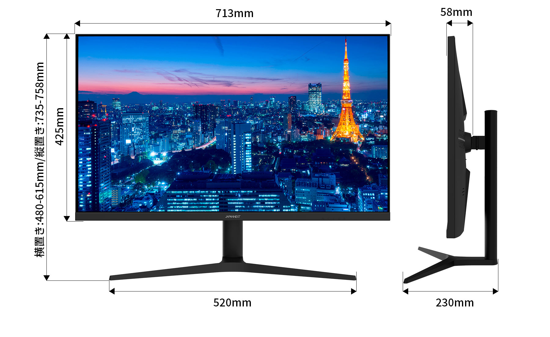 最大135mm(横置時)の範囲で高さ調整を行うことが可能な便利な昇降式スタンドを搭載。また、90度右に回転させての縦での使用も可能です。