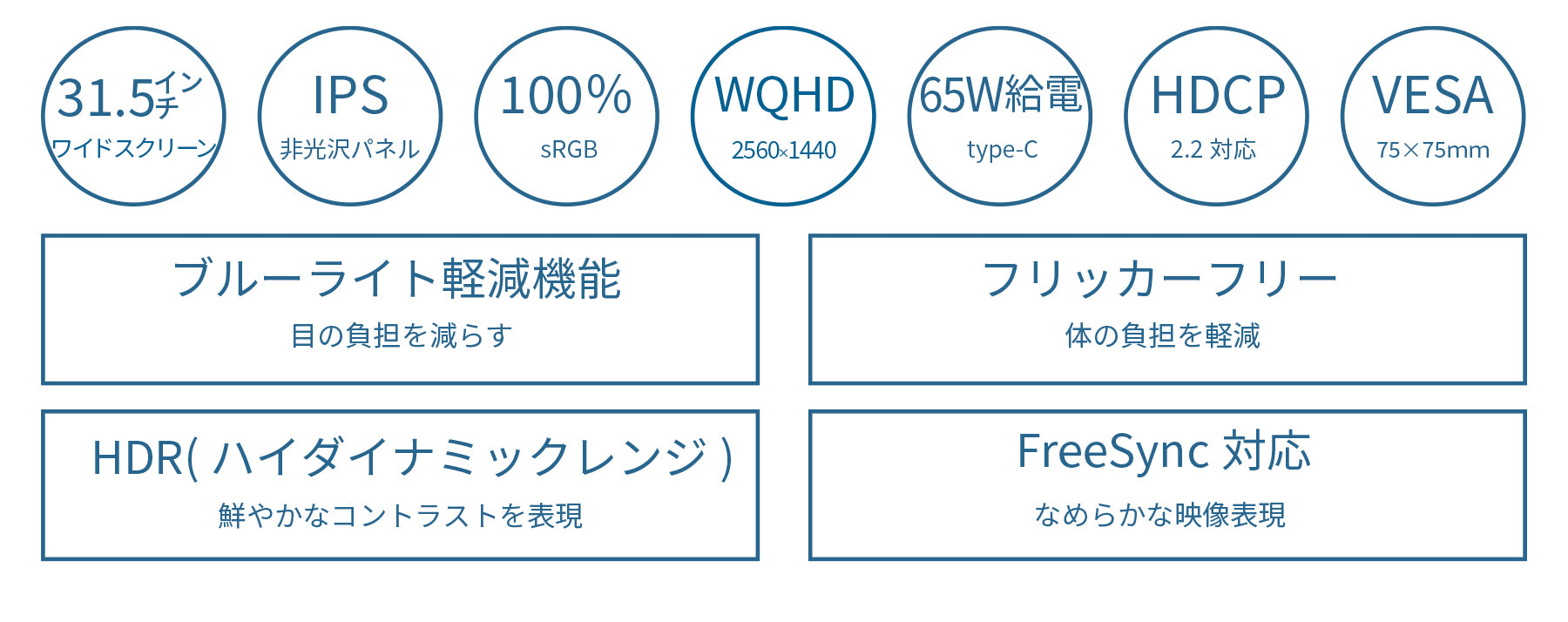 31.5インチのIPSパネルを搭載、WQHD(2560x1440)解像度に対応した液晶モニターです。フルHD(1920x1080)解像度より+78%も高精細でデスクワーク使用時には画面を広く、また写真や動画視聴の際はさらに美しく表示します。