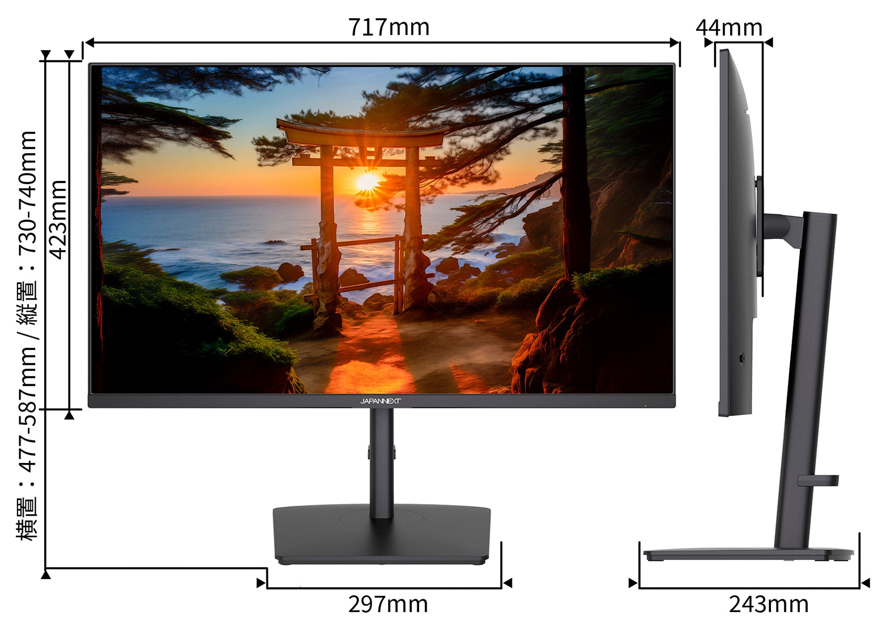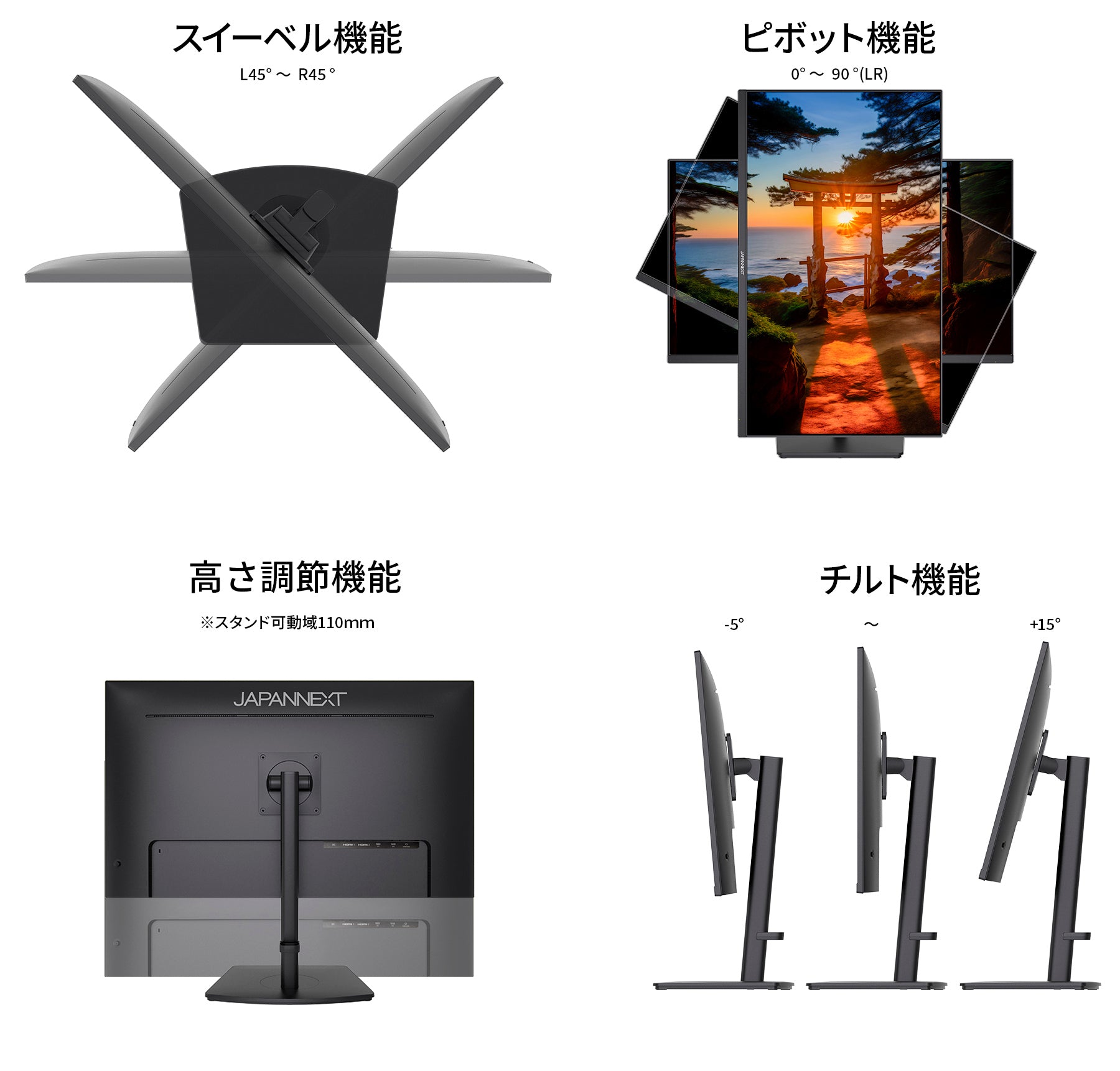 高さ調整が可能な、昇降式スタンドを採用。110mmの範囲でお好みの高さにモニターの高さを調整出来ます。さらにピボット機能を搭載で90度回転させて縦での使用も可能です。