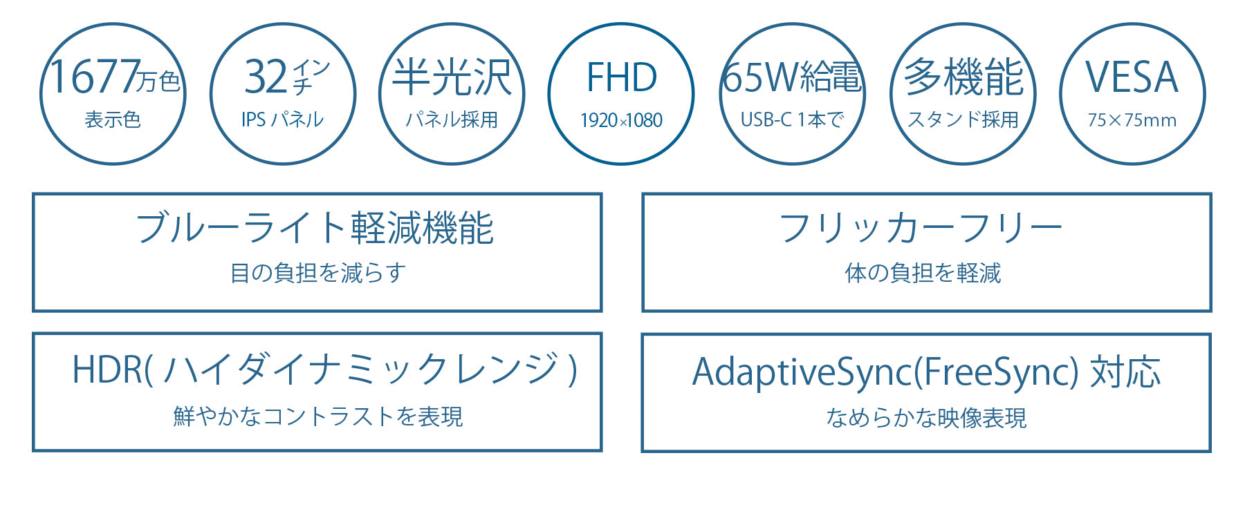 インターフェイスは、HDMI 1.4 x1(75Hz)、DisplayPort1.2 x1(75Hz)とUSB Type-C x1 (75Hz/最大65W給電)を装備し、様々な機器との接続が可能です。USB-C(最大65W給電)は、対応のPCであればUSB-Cケーブル1本でモニターへの映像出力とノートPCへの給電が可能。ケーブル1本でスッキリ接続出来るだけでなく、テレワーク、出社併用の場合などノートPCのACアダプターを持ち運ぶ必要が無くなります。