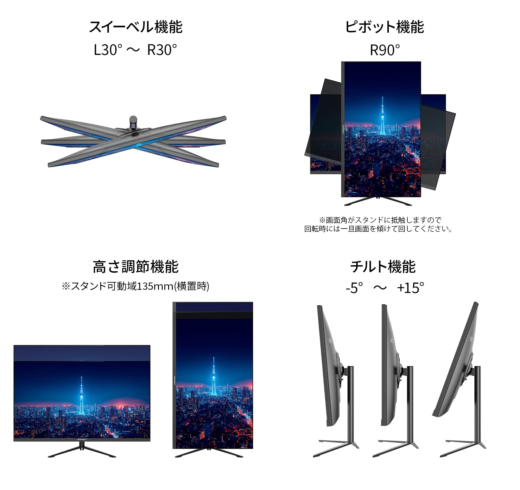 高さ調整が可能な昇降式多機能スタンドを搭載、最大135mmの範囲(横置時)で最適な高さに画面を調整可能です。また縦画面として使用出来るピボット(回転)機能にも対応します。スイーベル(首振り)機能は、左右各30°の範囲で動かせます。