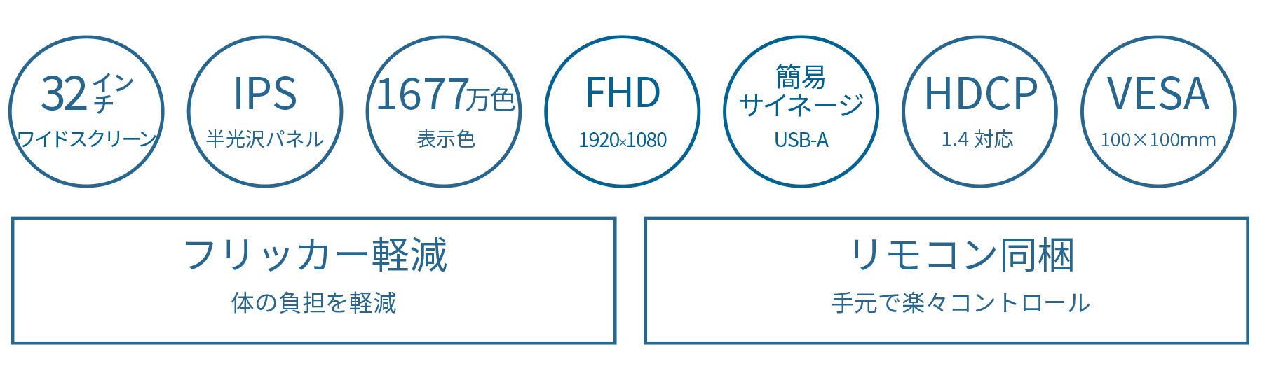 32インチのIPSパネルを搭載した、フルHD(1920x1080)解像度の大型液晶ディスプレイです。大画面液晶は大きな会議室での使用はもちろん、サイネージ用途や、映画などの鑑賞等様々な用途にお使いいただけます。