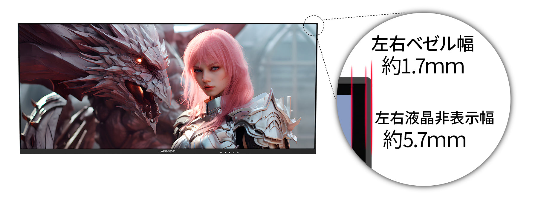 UWQHD(3440x1440)解像度はフルHDの約2.4倍の高解像度を実現、水平解像度はフルHDより80%広く、ゲームプレイ時だけでなく、デスクワークに使用時にも高い生産性を実現できます。