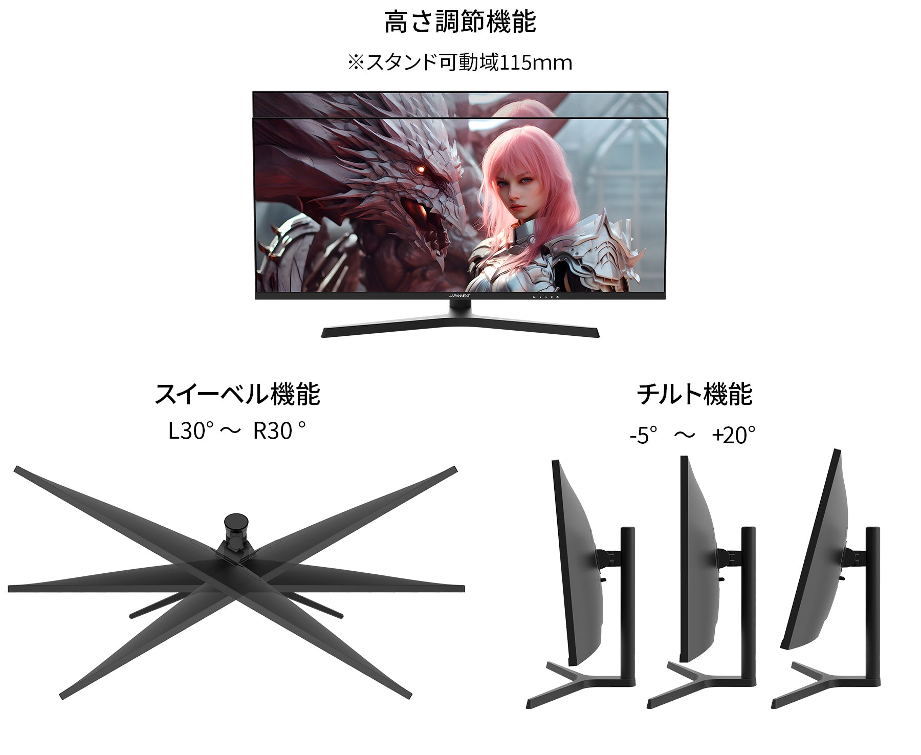 最大115mmの範囲で高さ調整を行うことが可能な便利な昇降式スタンドを搭載。また、水平方向のスイーベル(左右各30度)、上下の角度調整チルト(-5度~+20度)も可能です。