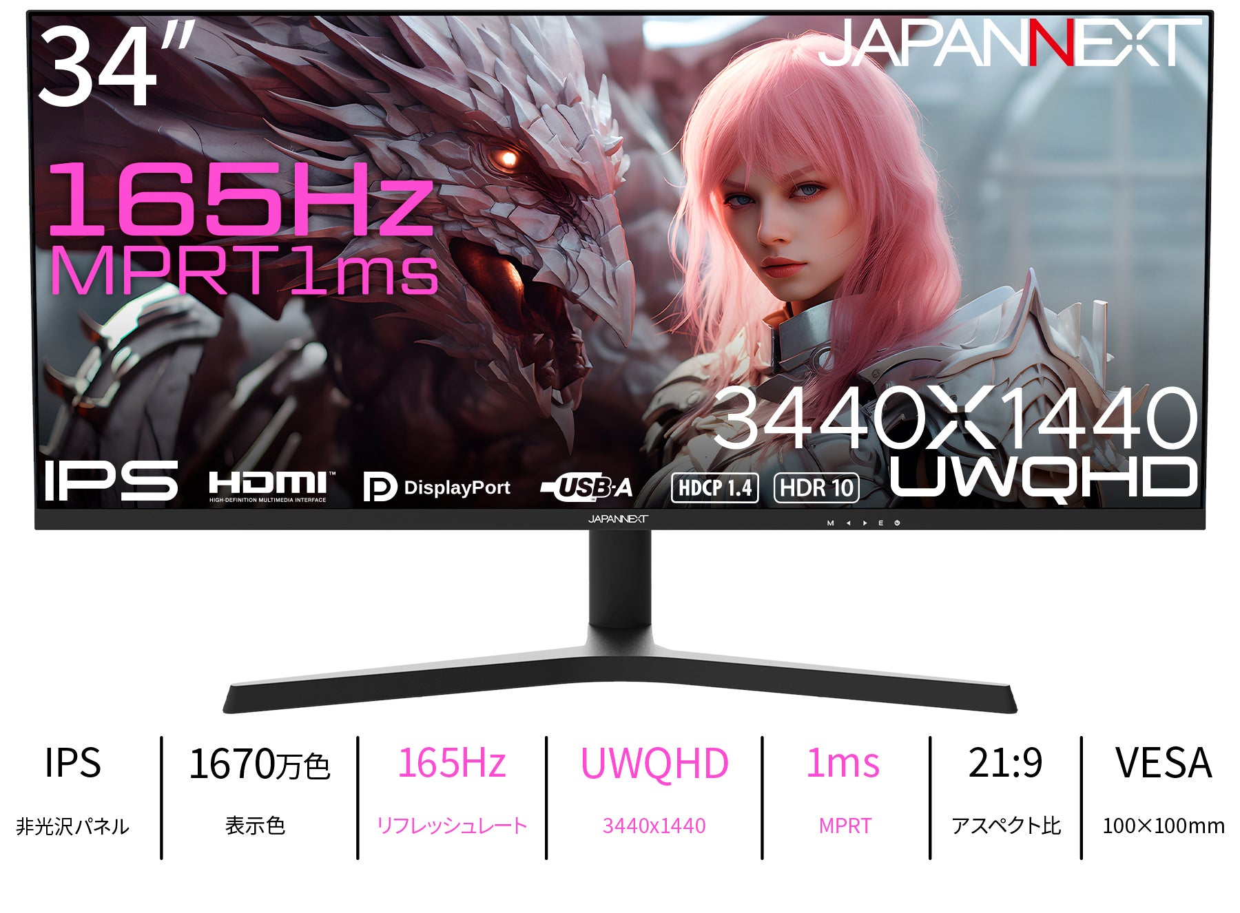 34インチのIPSパネルを採用、165Hzの高速リフレッシュレートに対応し、昇降式多機能スタンドを搭載した、UWQHD(3440x1440)解像度のゲーミングモニターです。