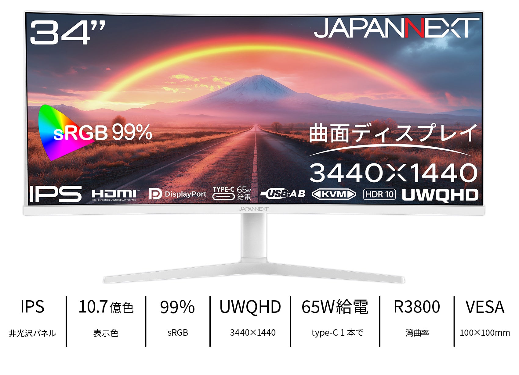 大画面34インチのIPSパネルを搭載し、アスペクト比21:9でUWQHD(3440x1440)解像度に対応した、ホワイトカラーの湾曲ウルトラワイド液晶モニターです。