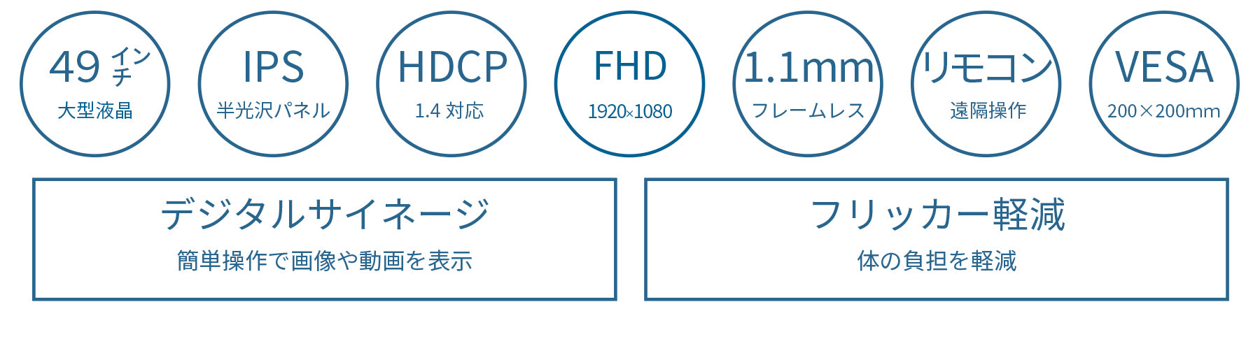 49インチのIPSパネルを搭載した、フルHD(1920x1080)解像度の大型液晶ディスプレイです。大画面液晶は大きな会議室での使用はもちろん、サイネージ用途や、映画などの鑑賞等様々な用途にお使いいただけます。
