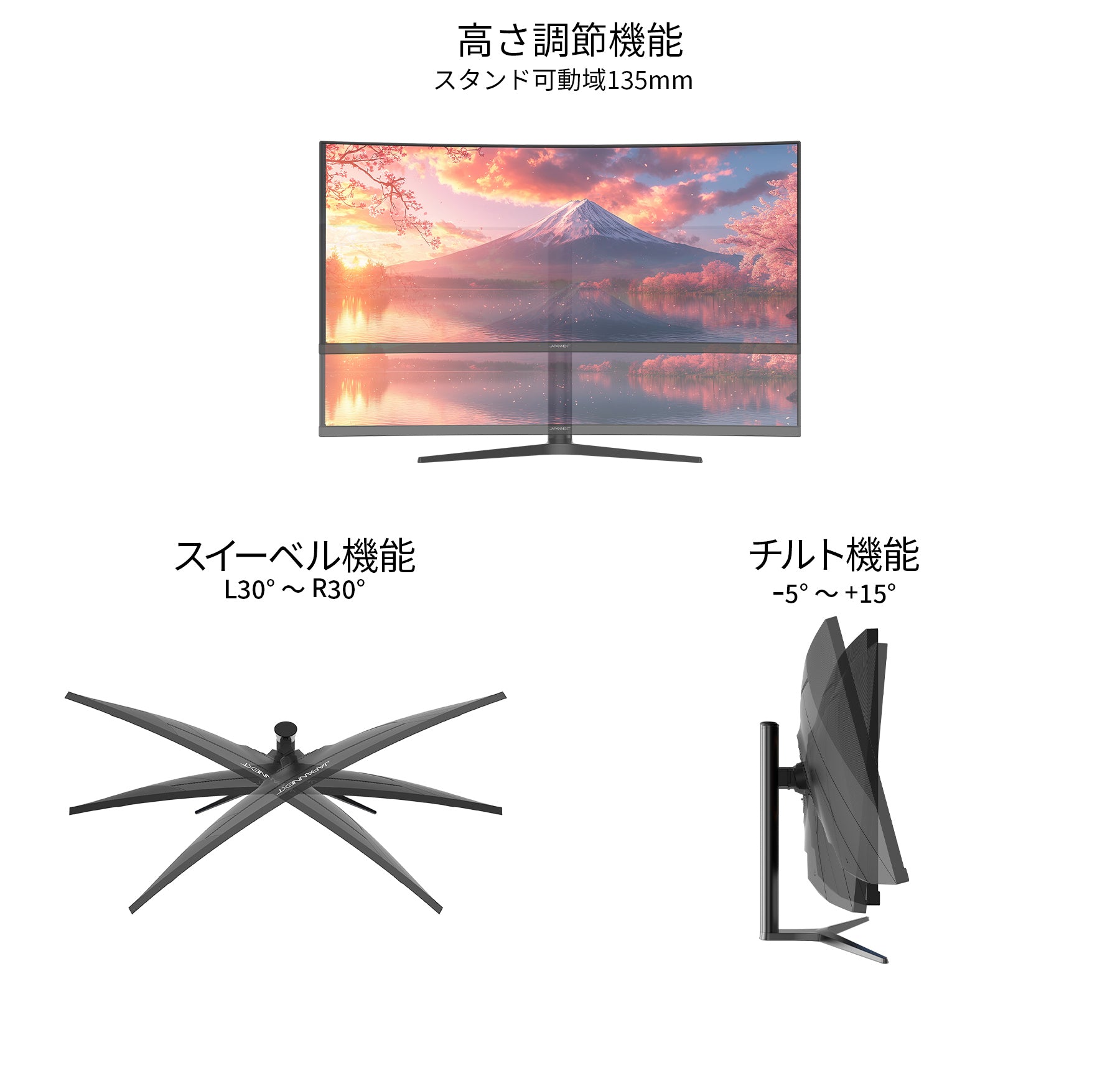 最大135mmの範囲で高さ調整を行うことが可能な昇降式多機能スタンドを搭載。また、水平方向のスイーベル(左右各30度)、上下の角度調整チルト(-5度~+15度)も可能です。