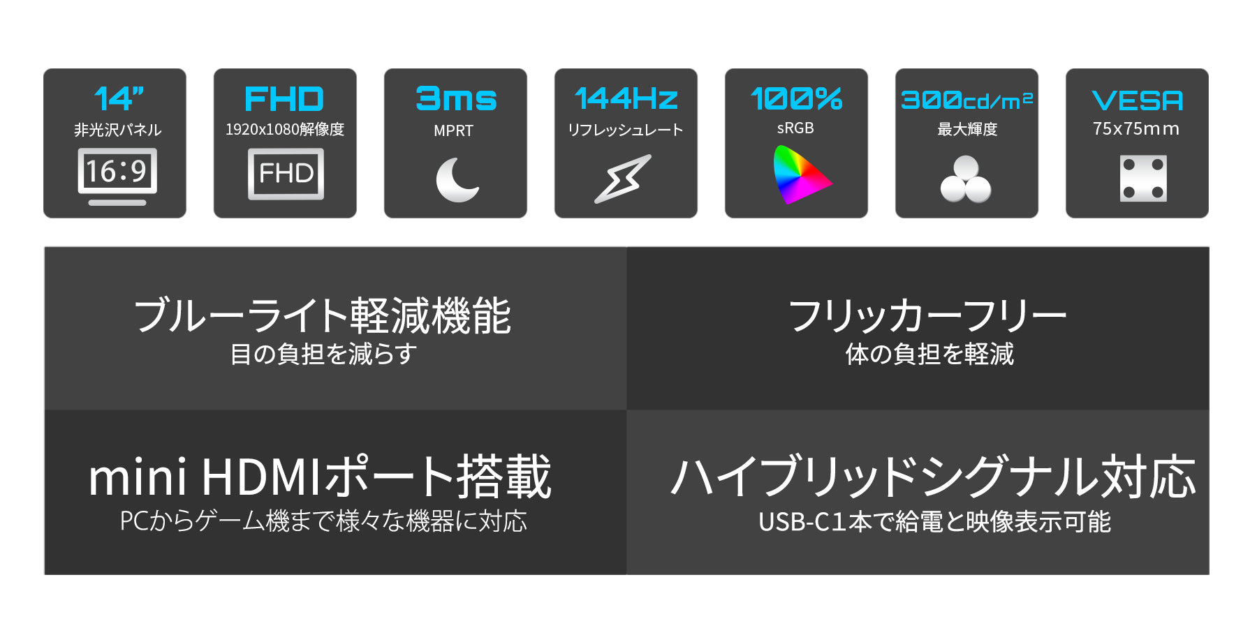 HDRに対応した14インチ、IPSパネル搭載、144Hzの高速リフレッシュレートに対応したフルHD(1920x1080)解像度のモバイルゲーミングモニターです。