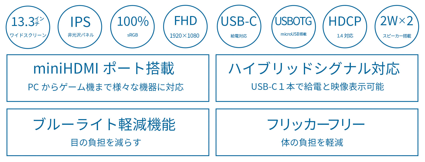HDRに対応した13.3インチ フルHD(1920x1080)解像度 タッチパネル対応のモバイルモニターです。約538gの軽量で携帯性に優れ、外出時やテレワークなど場所を選ばすディスプレイを活用できます。