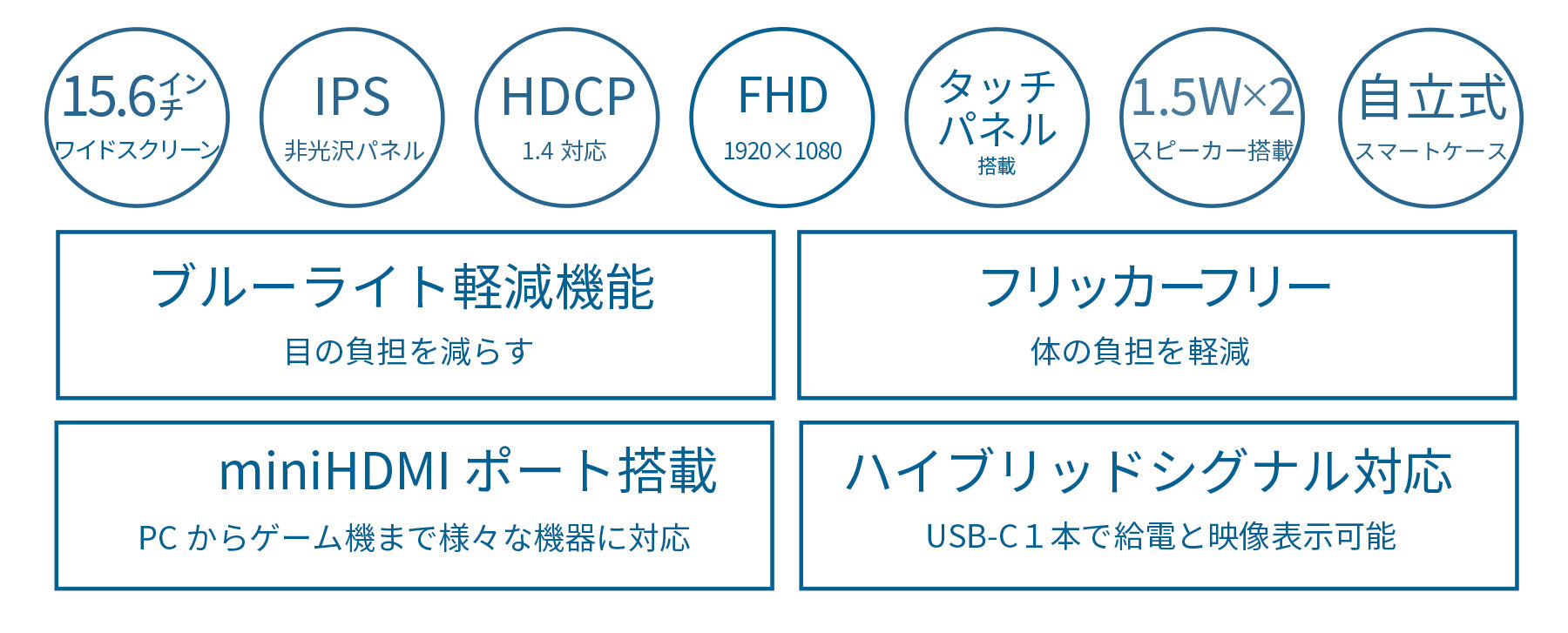 15.6インチのIPSパネルを搭載し、使いやすいフルHD(1920x1080)解像度に対応したモバイルモニターです。上下左右170度に対応した高画質IPSパネルを搭載し、コンテンツを色鮮やかに映し出します。