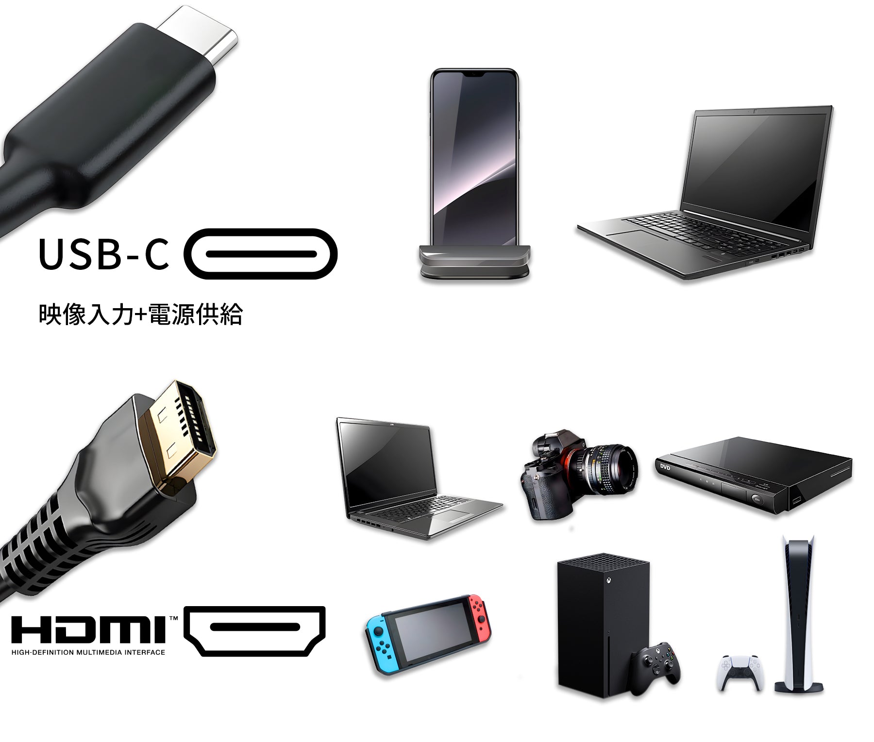 USB Type-Cケーブル1本で電力供給と映像表示が可能となっており、ケーブルまわりがスッキリします。