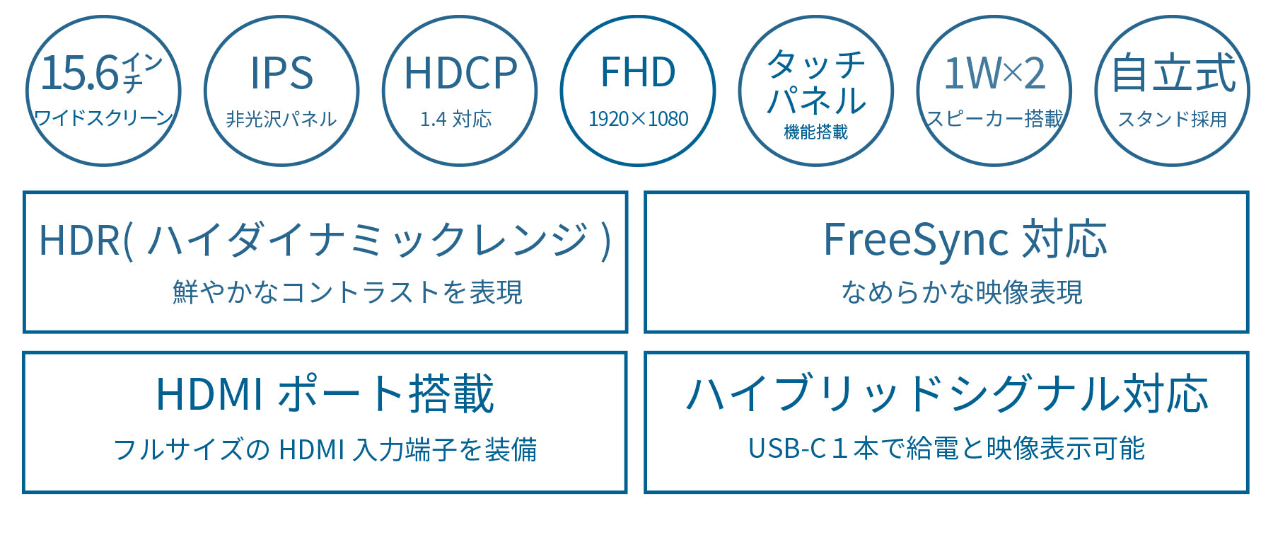 HDRに対応した15.6インチ、フルHD(1920x1080)解像度でタッチパネル対応のモバイルモニターです。