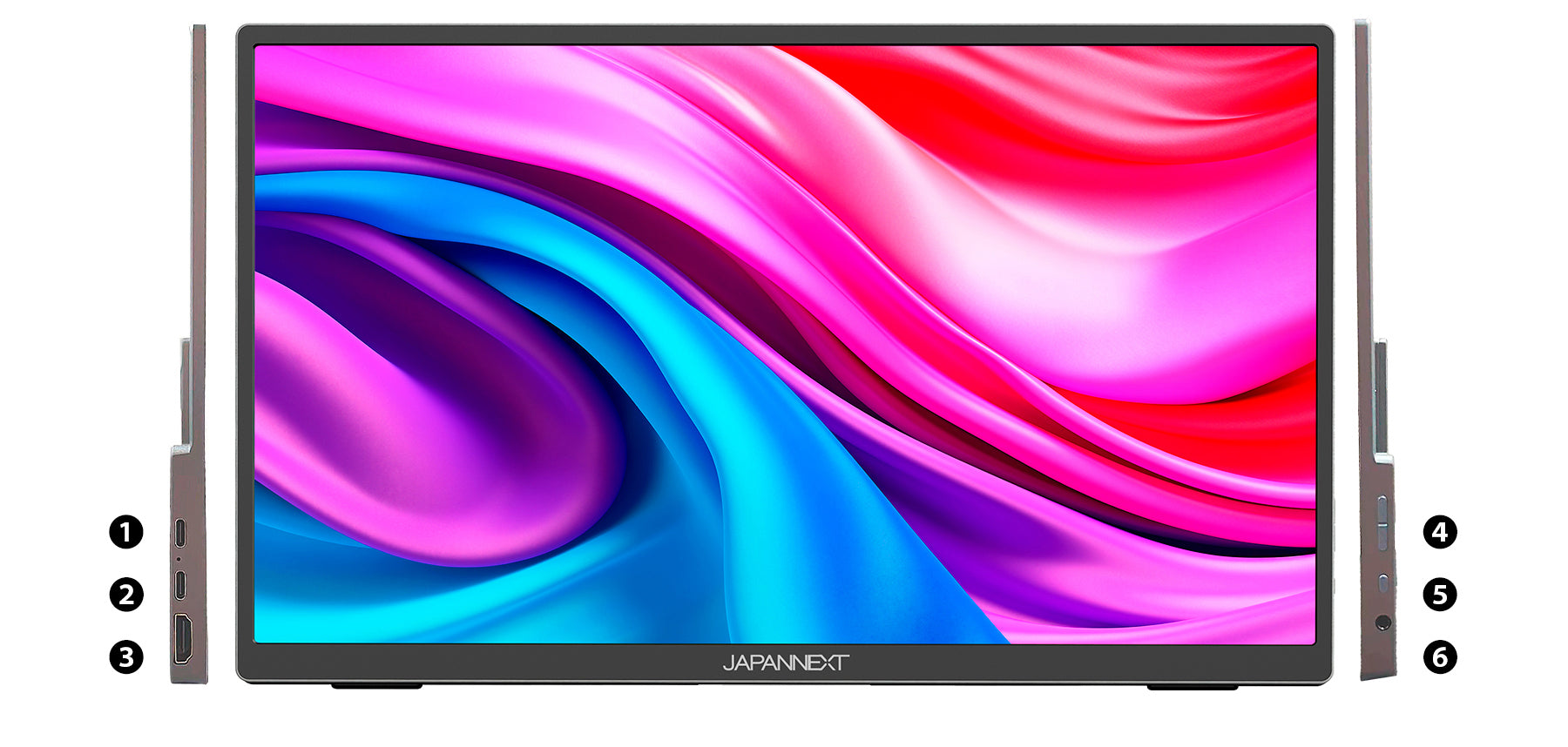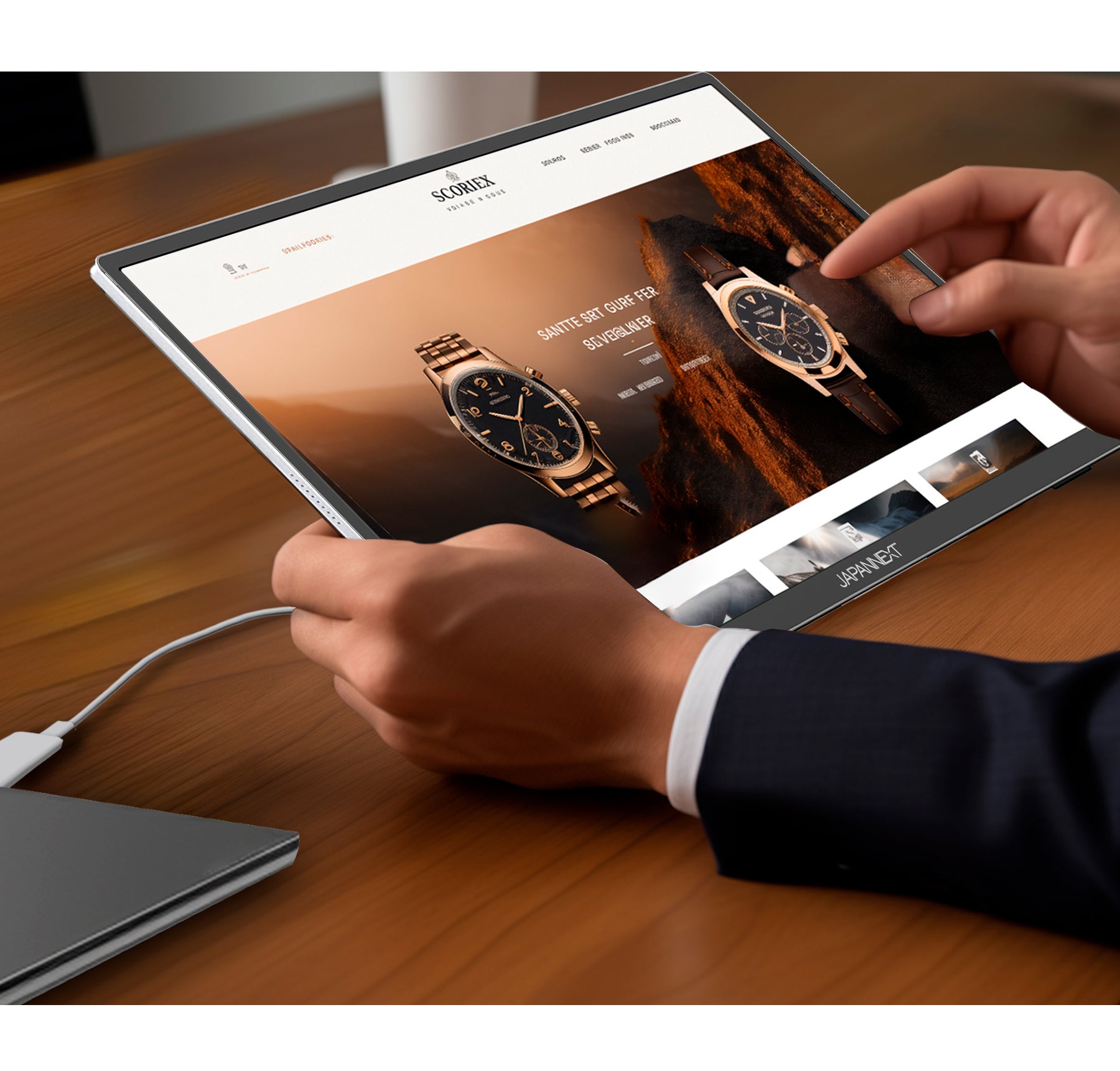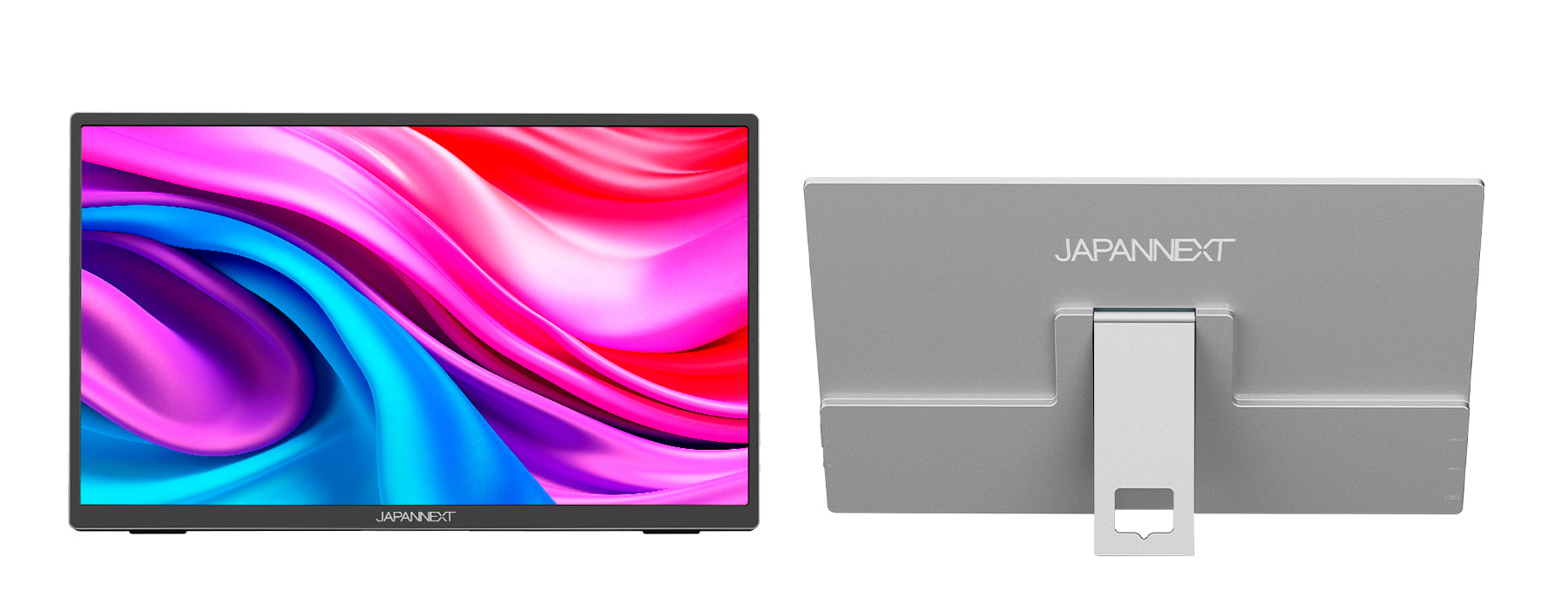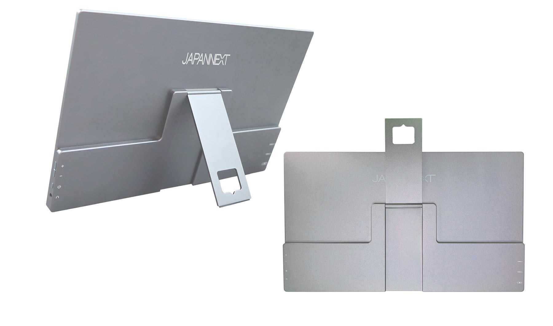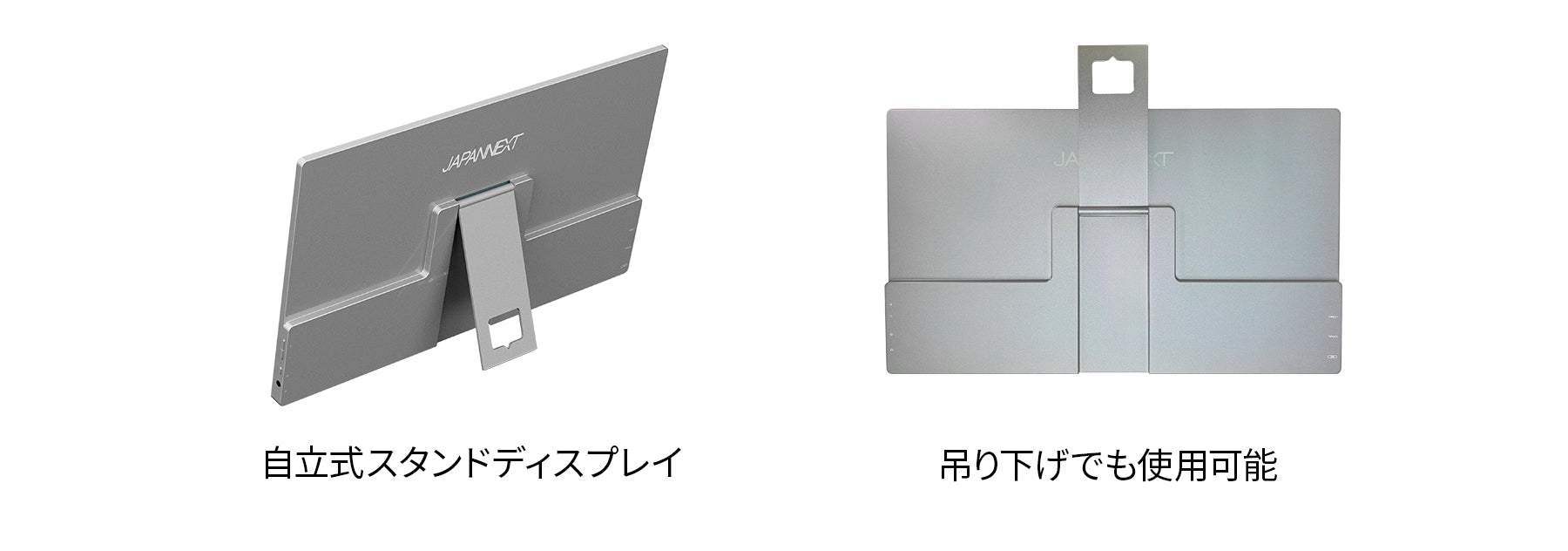 モニター背面に収納式の自立スタンドを搭載しているので、どこでもデュアルディプレイ環境の構築が可能です。また、携帯時に便利なJAPANNEXT特製ポーチを同梱。製品本体をホコリや傷から守り、持ち運びに最適です。