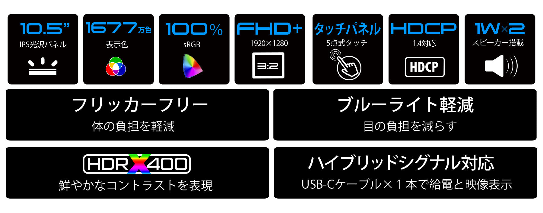 10.5インチのIPSパネルを搭載し、使いやすいフルHD+(1920×1280)解像度に対応したモバイルモニターです。フルHD+(1920×1280)解像度は、従来のフルHD(1920×1080)解像度より縦の解像度が18%大きいので、ニュースやブログなどのウェブサイトを一度に表示できるコンテンツ量が増えます。