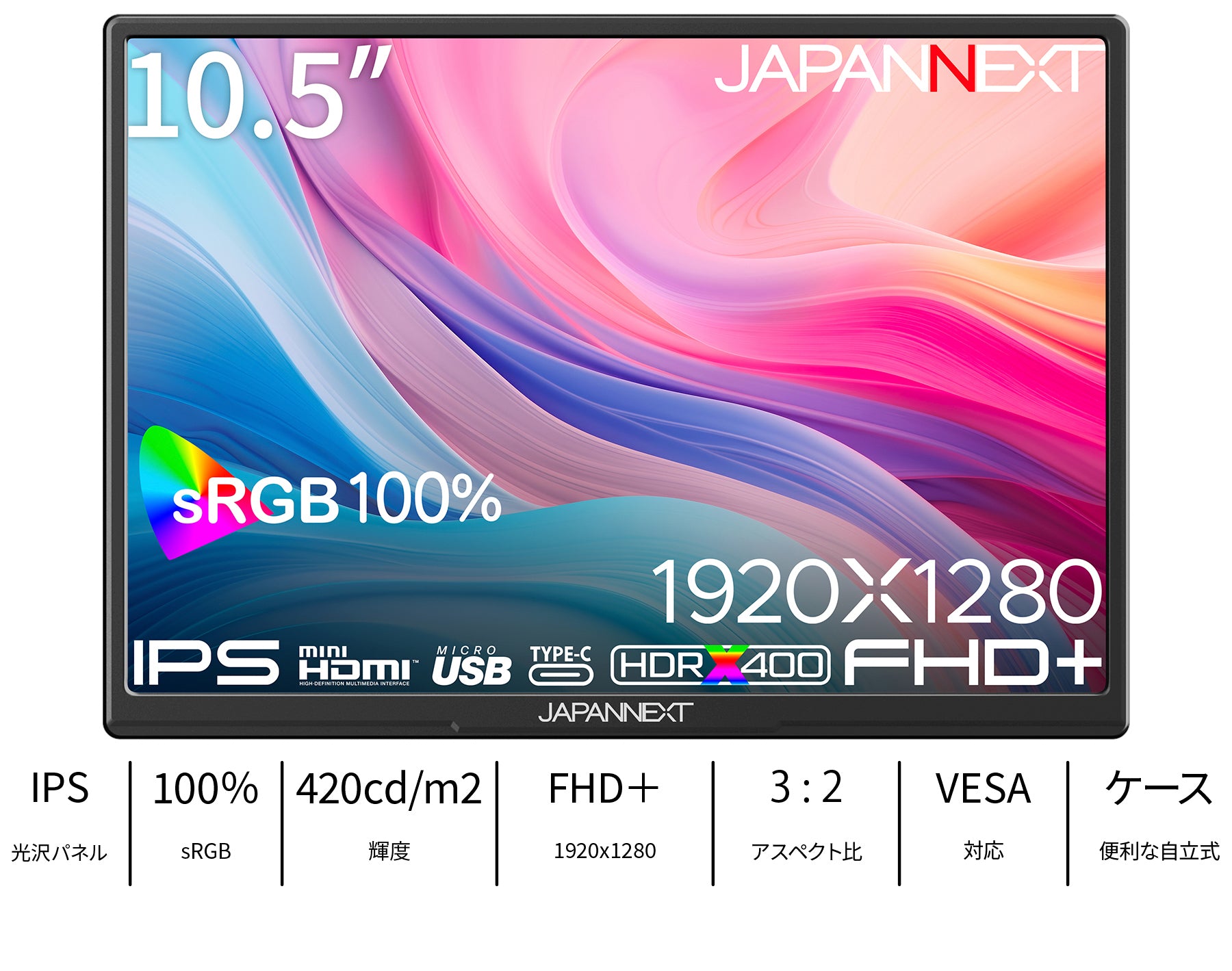 10.5インチのIPSパネルを搭載し、フルHD+(1920x1280)解像度に対応したモバイルモニターです。