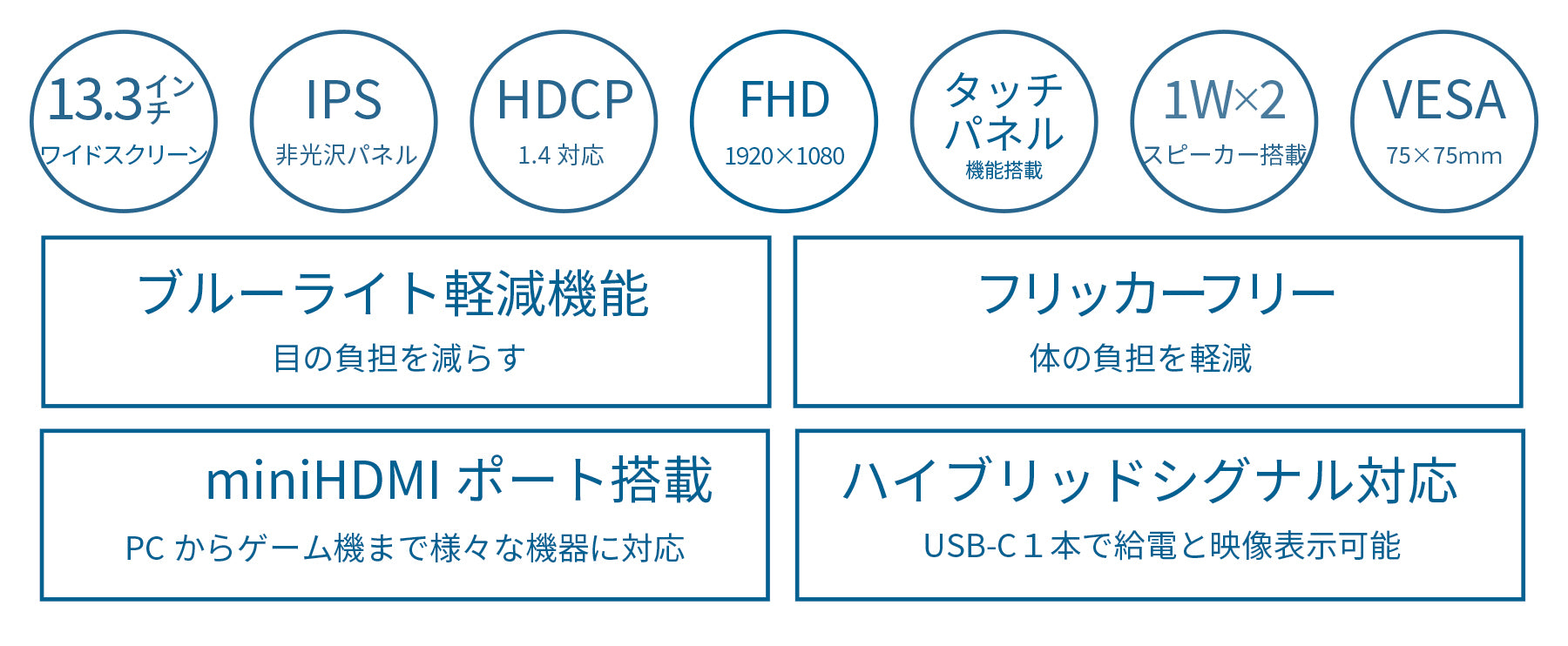 HDRに対応した13.3インチ フルHD(1920x1080)解像度 タッチパネル対応のモバイルモニターです。