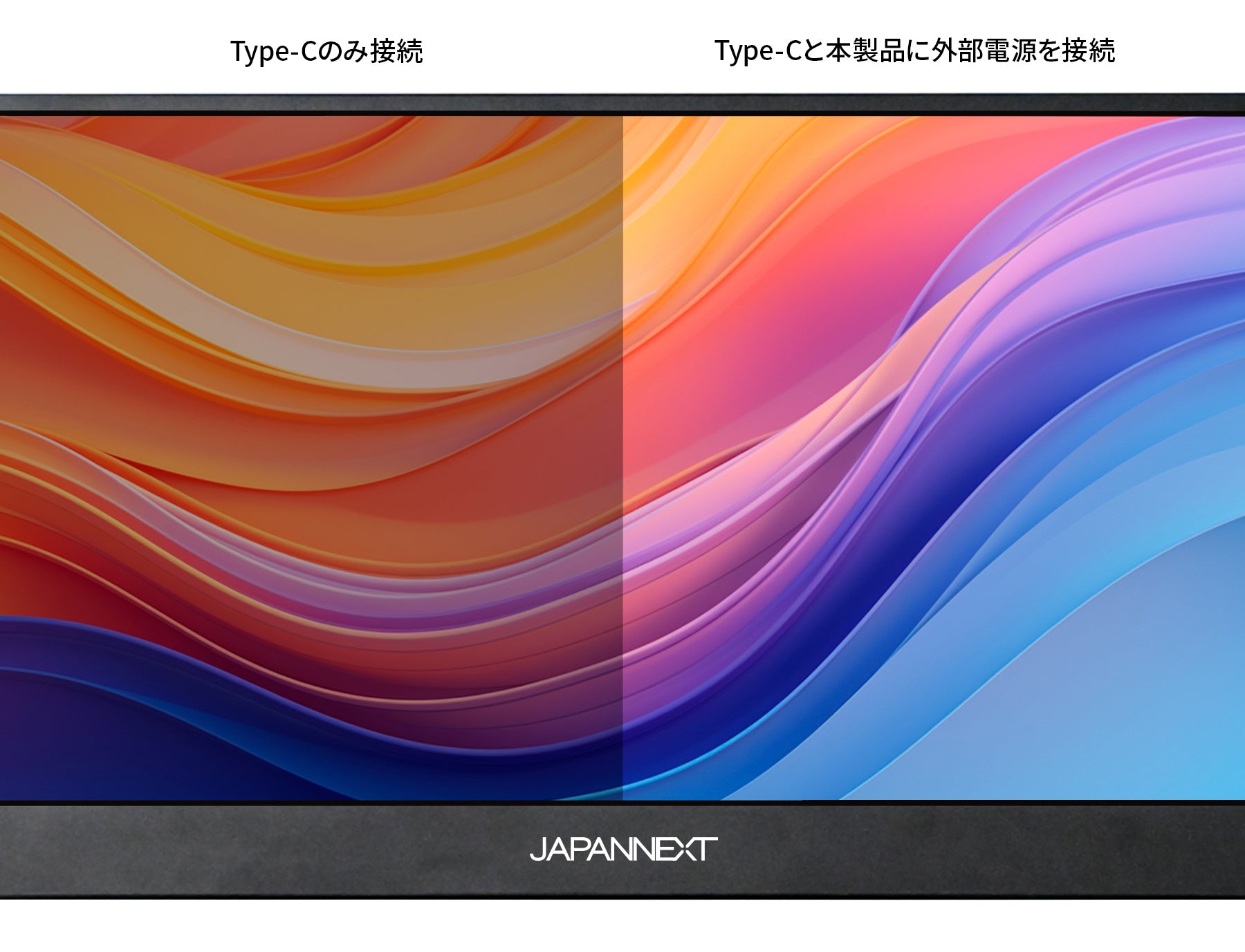 Type-C接続のみの場合、接続機種の給電能力に合わせて明るさを抑えて表示します。