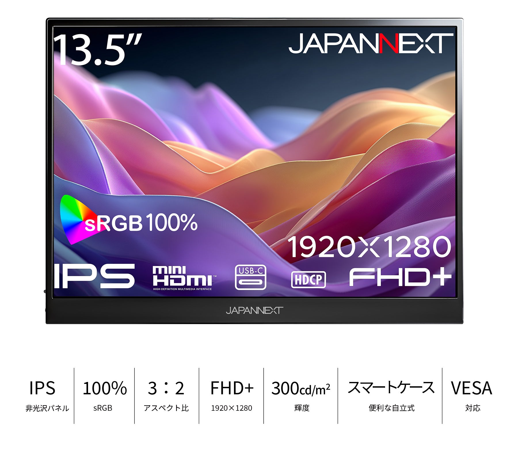 13.5インチのIPSパネルを搭載し、フルHD+(1920x1280)解像度に対応したモバイルモニターです。フルHD+(1920x1280)解像度は、従来のフルHD(1920x1080)解像度より縦の解像度が18%大きいので、ニュースやブログなどのウェブサイトを一度に表示できるコンテンツ量が増えます。