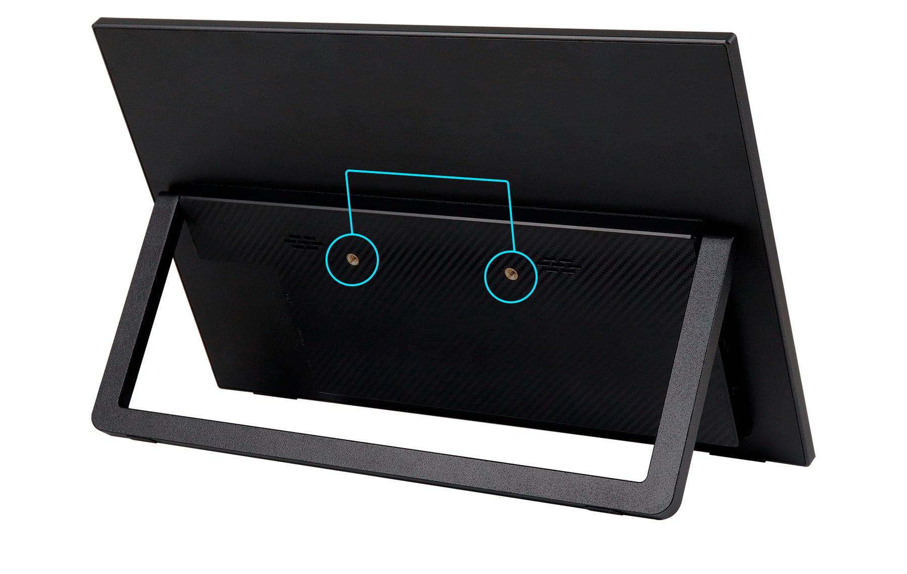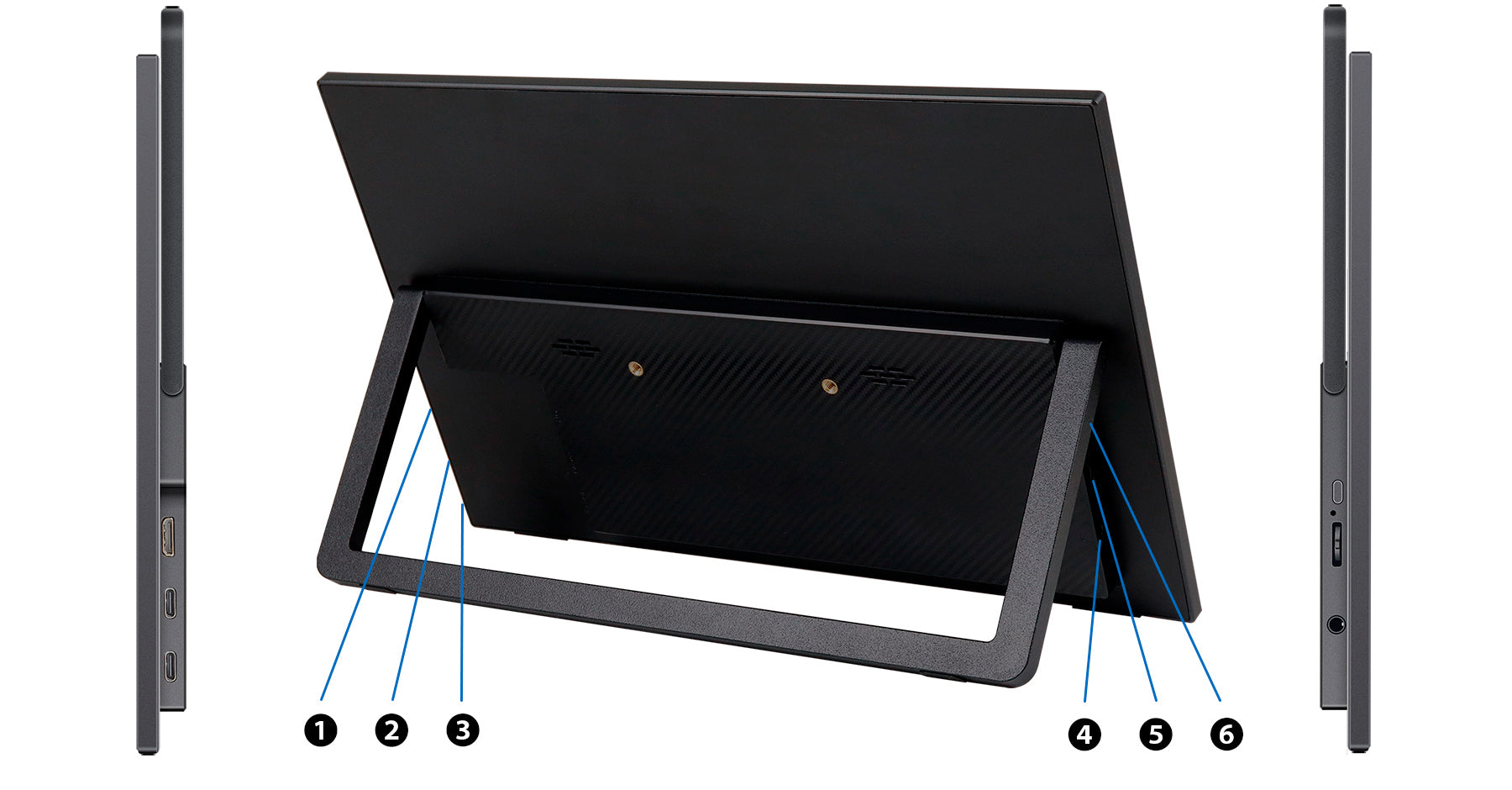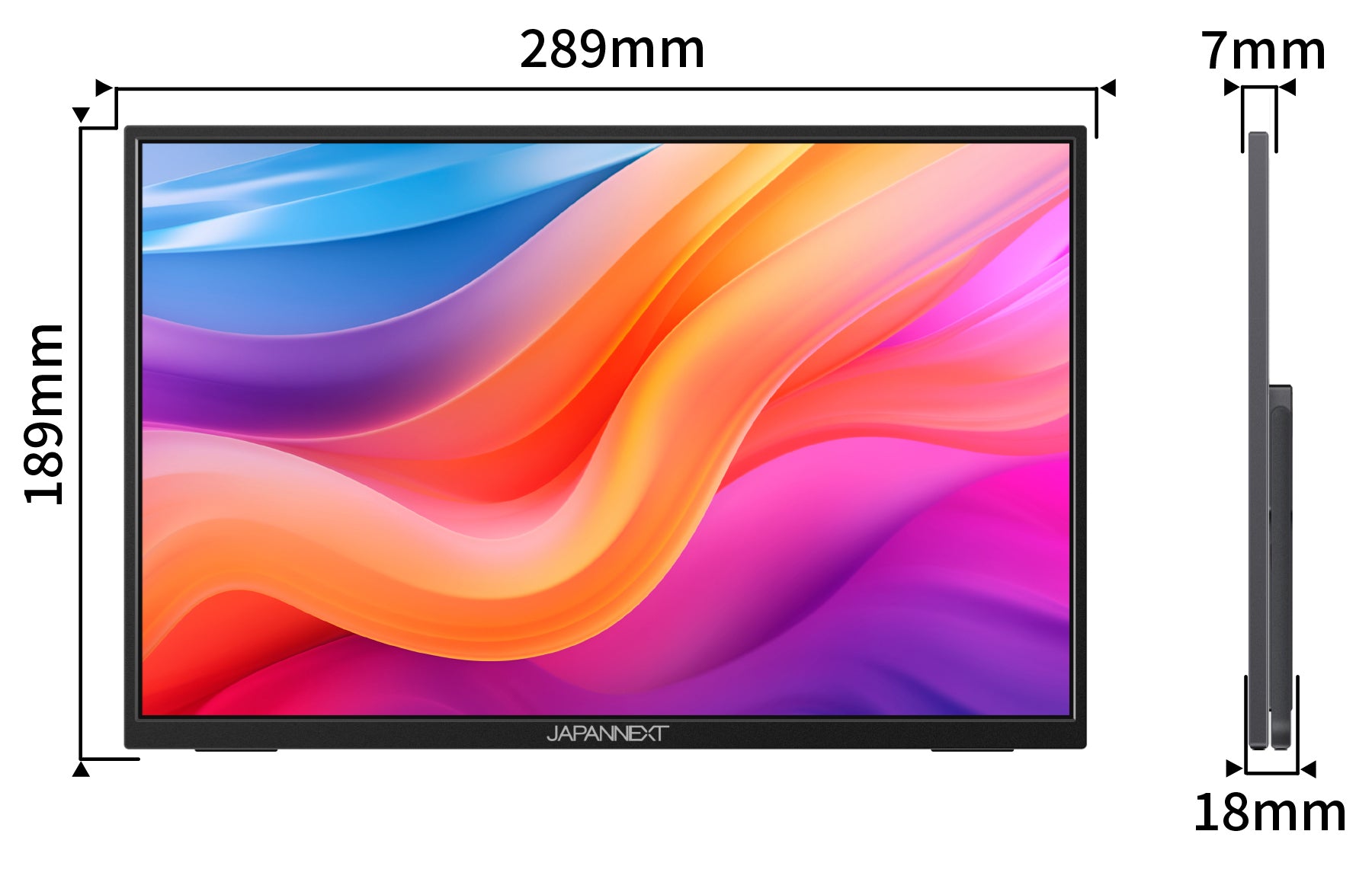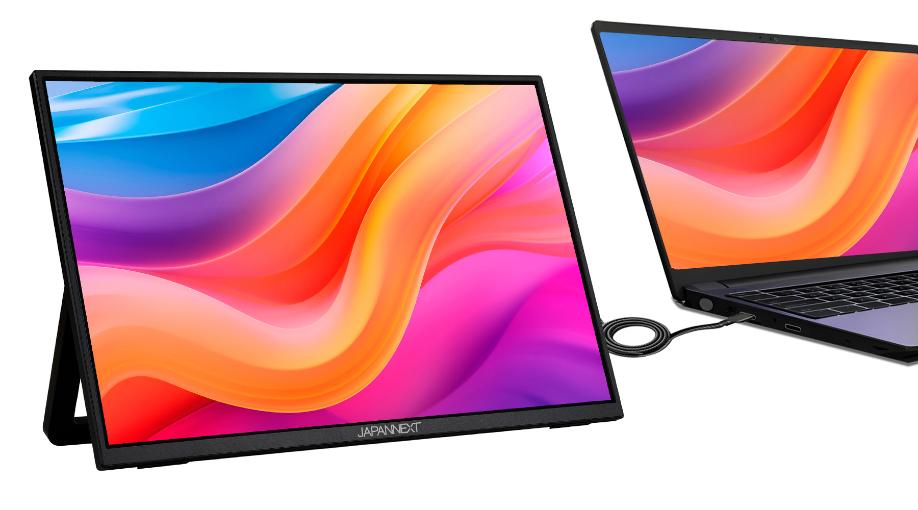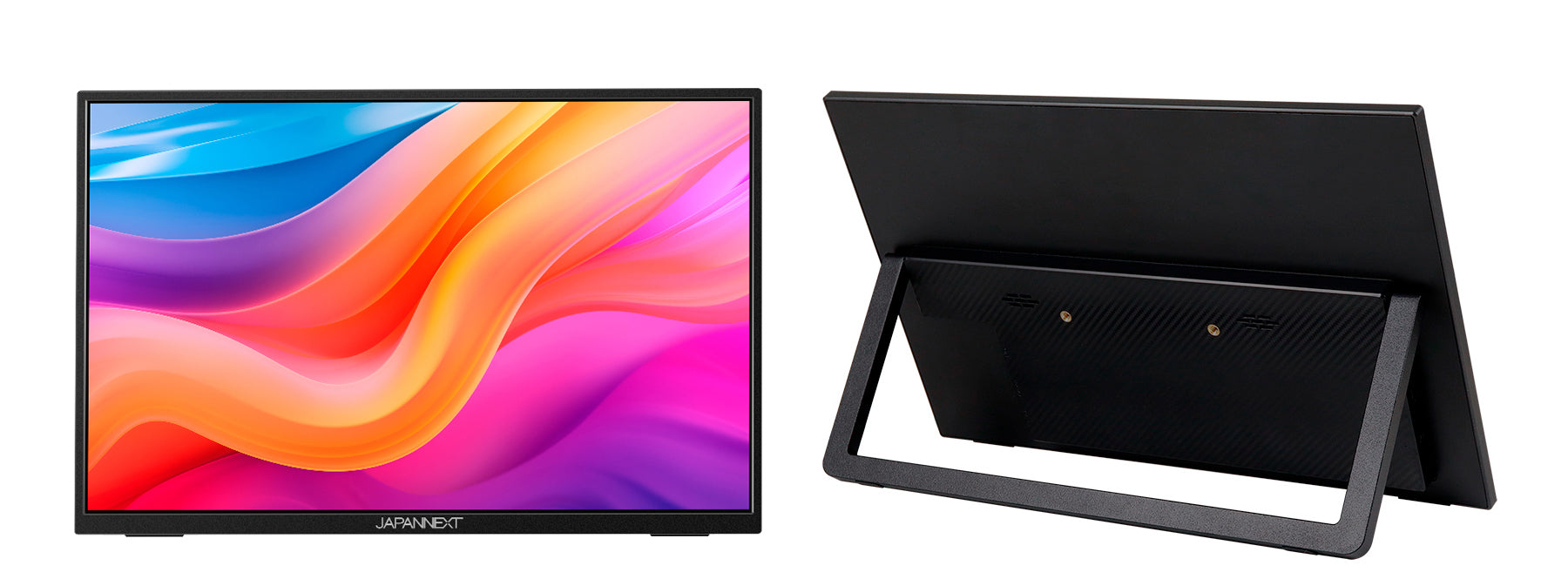 モニター背面にキックスタンドを搭載しているので自立して使用することができ、どこでもデュアルディプレイ環境の構築が可能です。また、携帯時に便利なJAPANNEXT特製ポーチを同梱。製品本体をホコリや傷から守り、持ち運びに最適です。