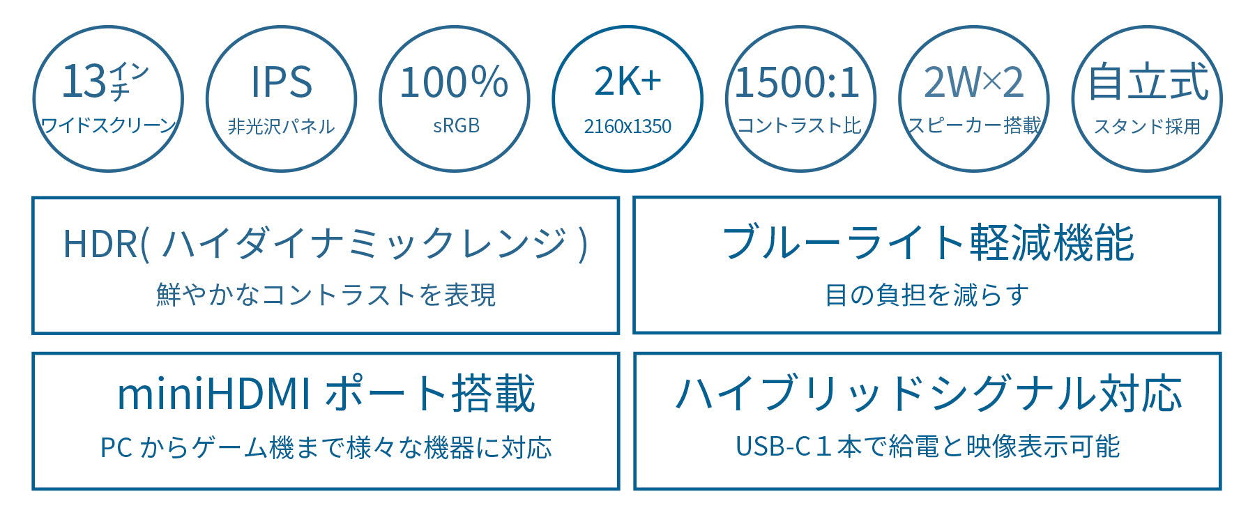 13インチでIPSパネル搭載を搭載し、2K+(2160x1350)解像度に対応したモバイルモニターです。2K+(2160x1350)解像度は、フルHD(1920x1080)解像度より+41%も高精細でデスクワーク使用時には画面を広く、また写真や動画視聴の際はさらに美しく表示します。携帯性に優れ、外出時やテレワークなど場所を選ばすディスプレイを活用できます。