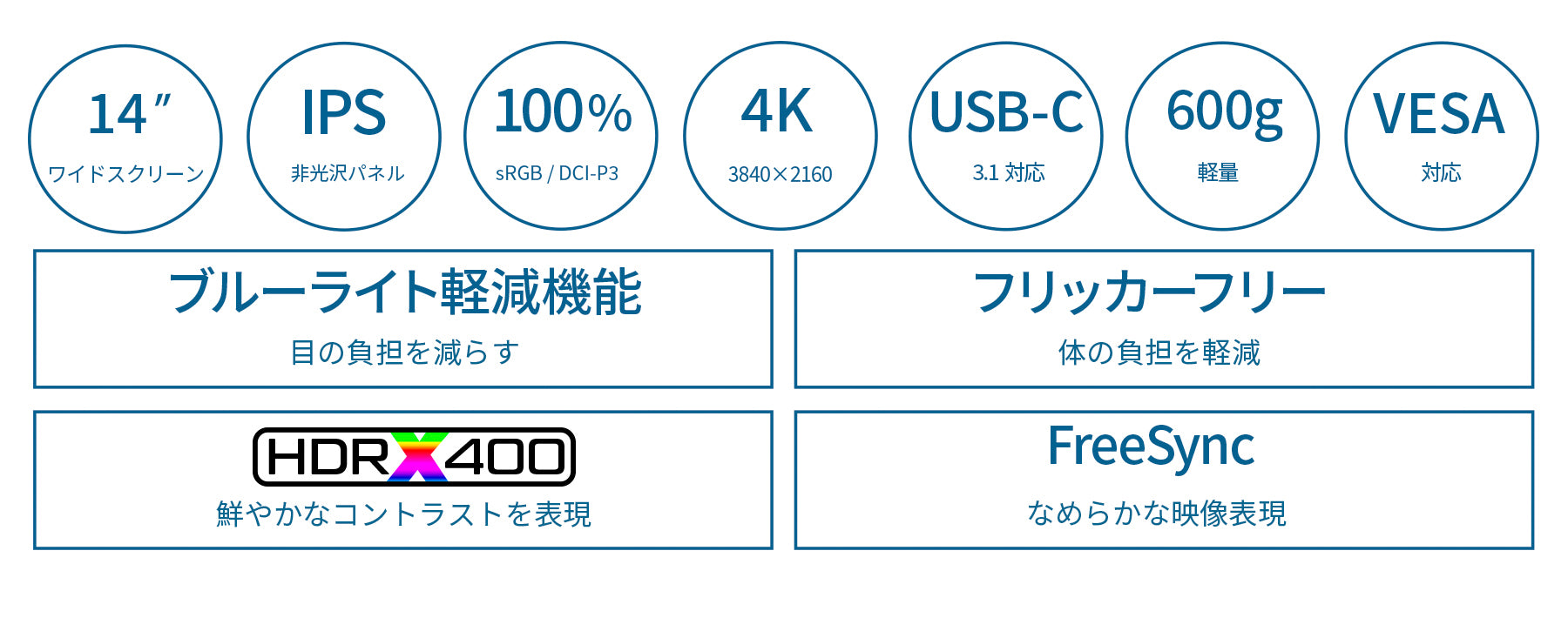 HDRに対応した14インチ IPSパネル搭載 4K(3840x2160)解像度のモバイルモニターです。携帯性に優れ、外出時やテレワークなど場所を選ばすディスプレイを活用できます。