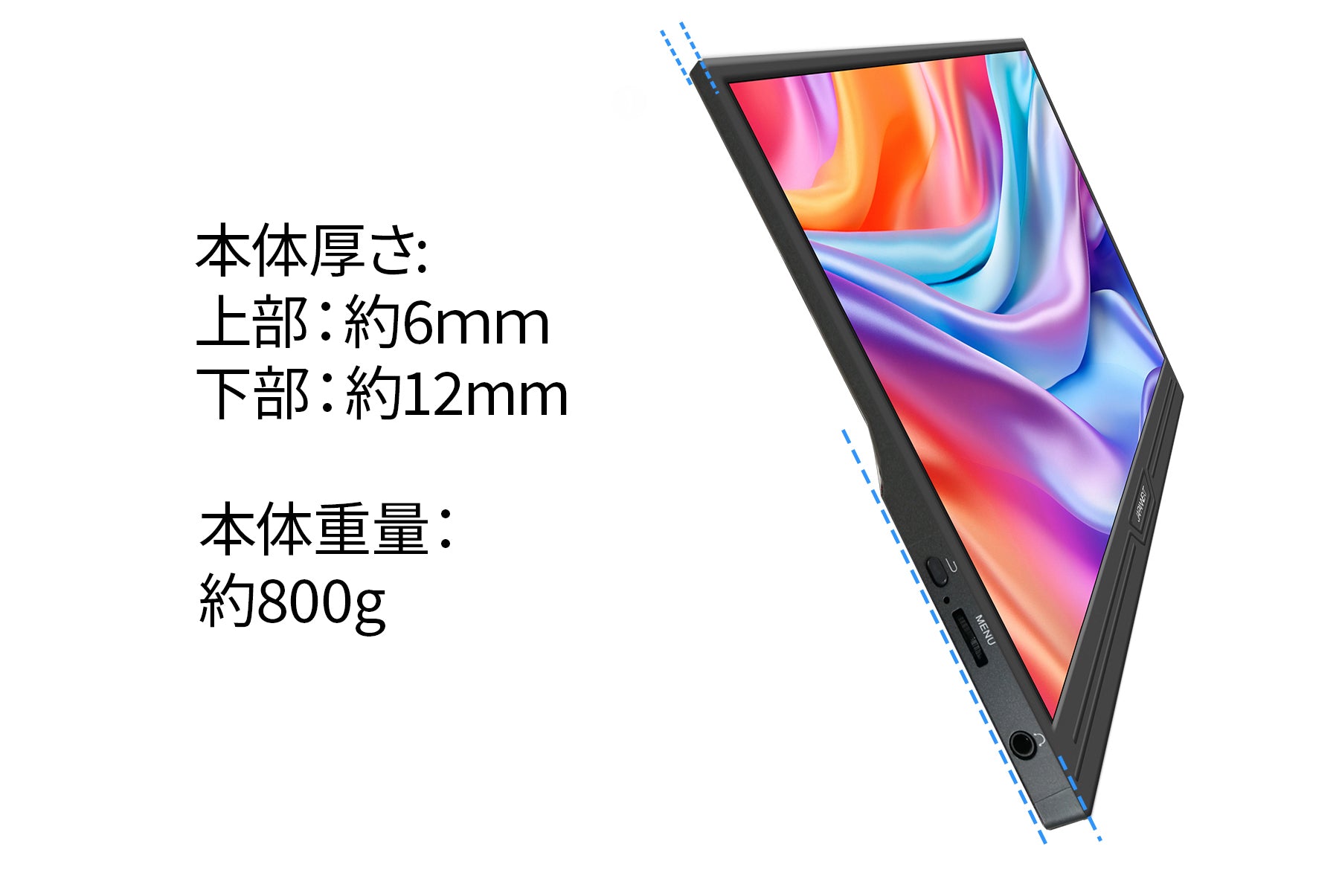 本体重量 約800g、側面厚さ:12mm、最薄部で6mmの薄さを実現させた