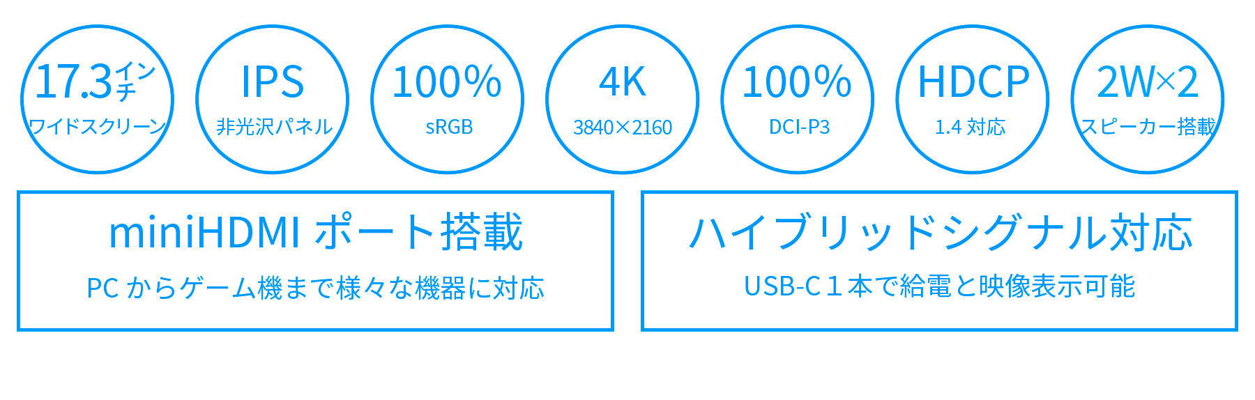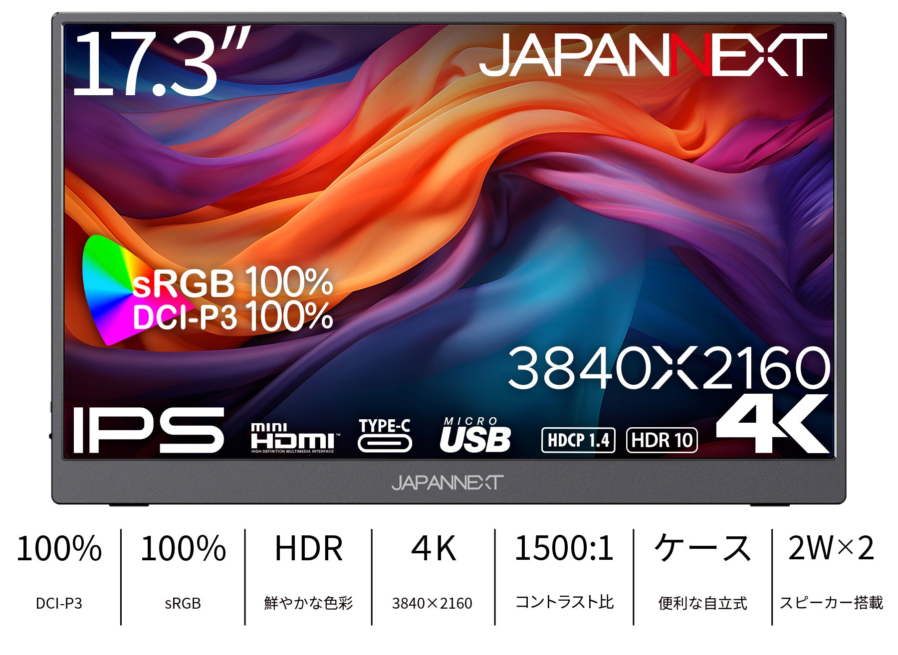 17.3インチのIPSパネルを搭載した、4K(3840x2160)解像度のモバイルモニターです。携帯性に優れ、外出時やテレワークなど場所を選ばすディスプレイを活用できます。4Kは、フルHD(1920×1080)解像度の約4倍の作業領域を実現する3840×2160ドットの解像度となり、高精細な表示を実現できます。