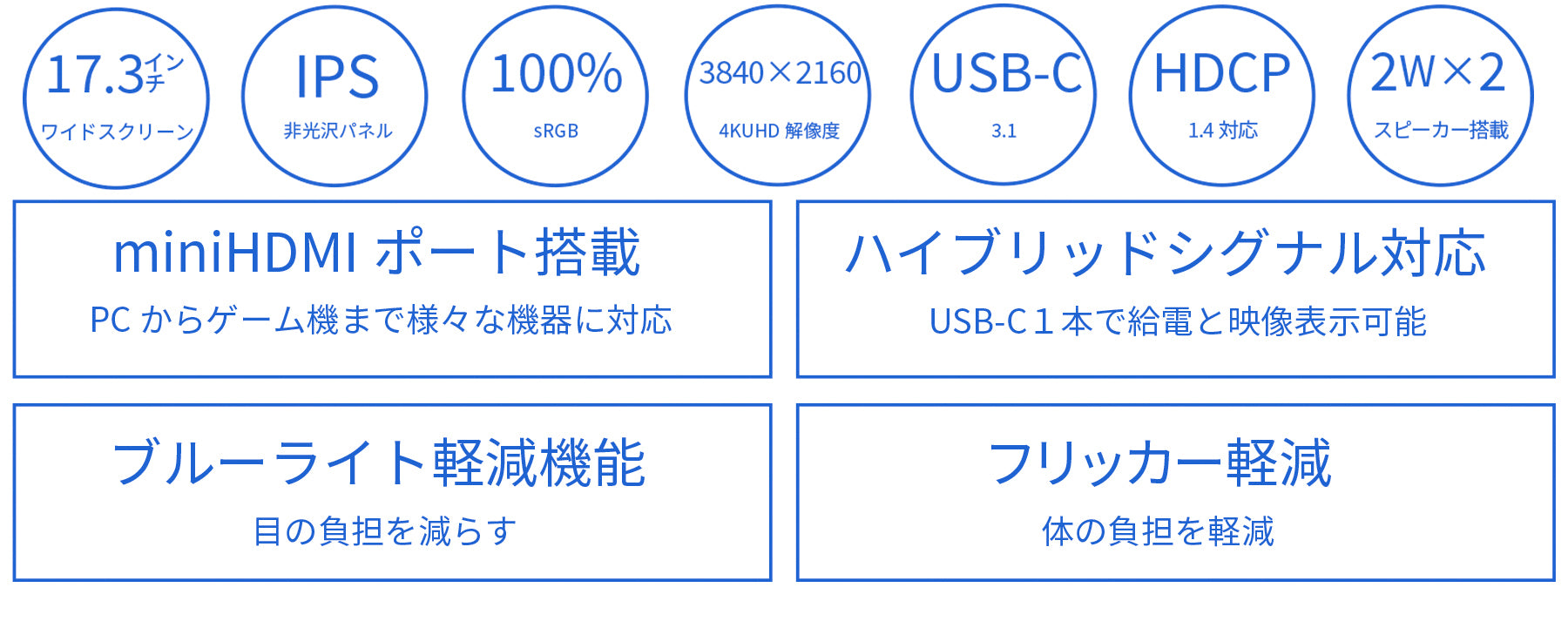 本製品はHDRに対応した大画面17.3インチ 4K(3840x2160)解像度のモバイルモニターです。17.3インチで約955gの軽量で大画面ディスプレイを持ち運んで、外出時やテレワークなど場所を選ばす高解像度ディスプレイを活用できます。