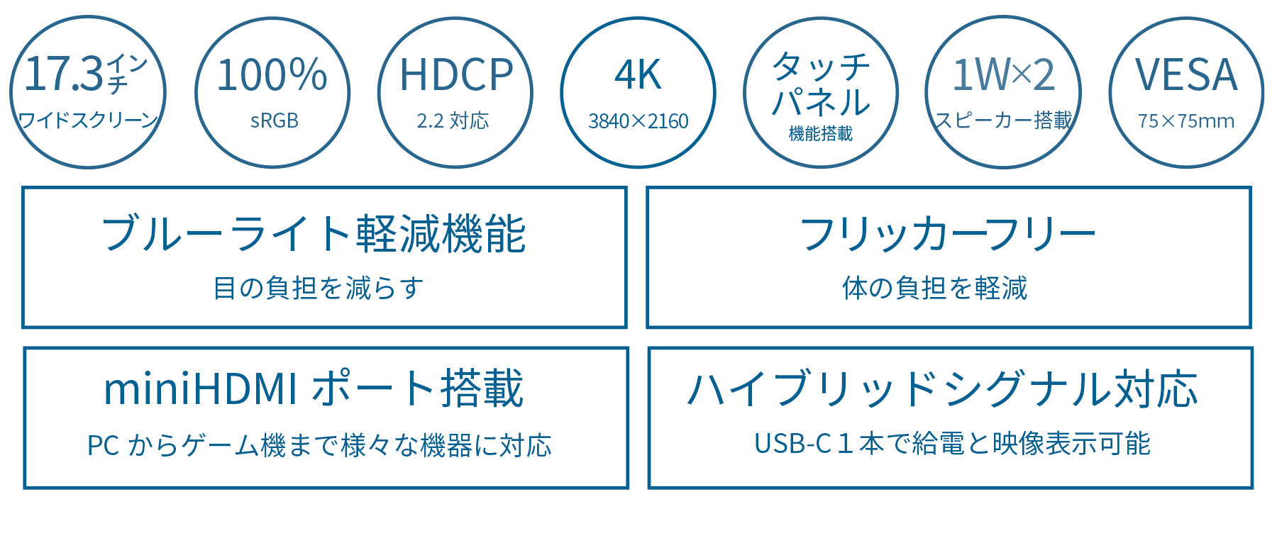 HDRに対応した17.3インチ 4K(3840x2160)解像度 タッチパネル対応のモバイルモニターです。携帯性に優れ、外出時やテレワークなど場所を選ばすディスプレイを活用できます。