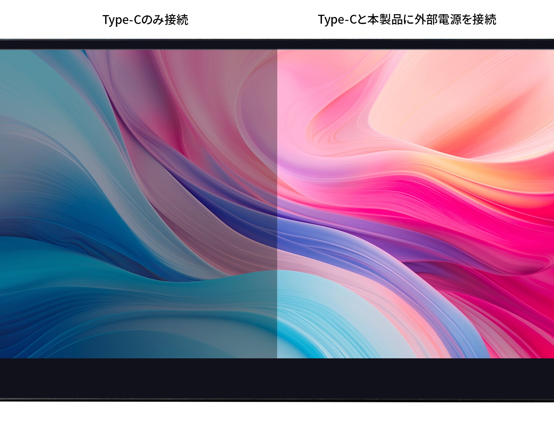 Type-C接続のみの場合、接続機種の給電能力に合わせて明るさを抑えて表示します。