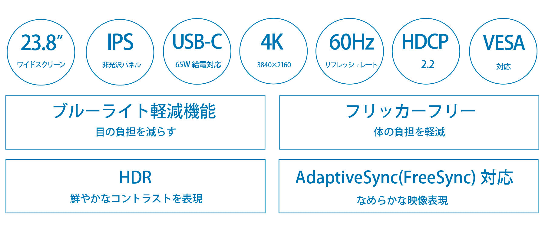 4K(3840x2160)解像度に対応。フルHD(1920x1080)解像度の4倍の高解像度は、圧倒的な高生産性を実現します。