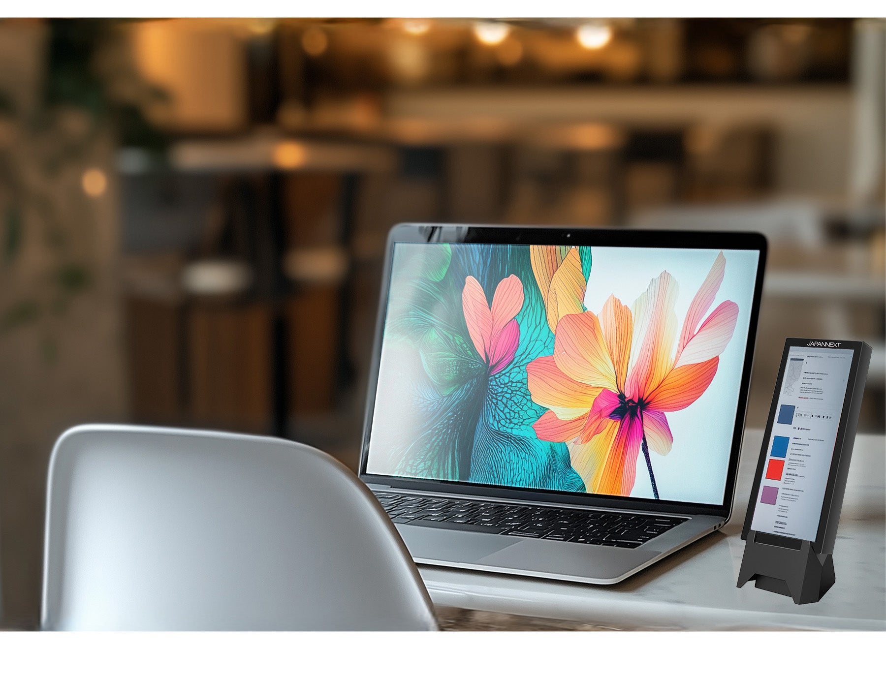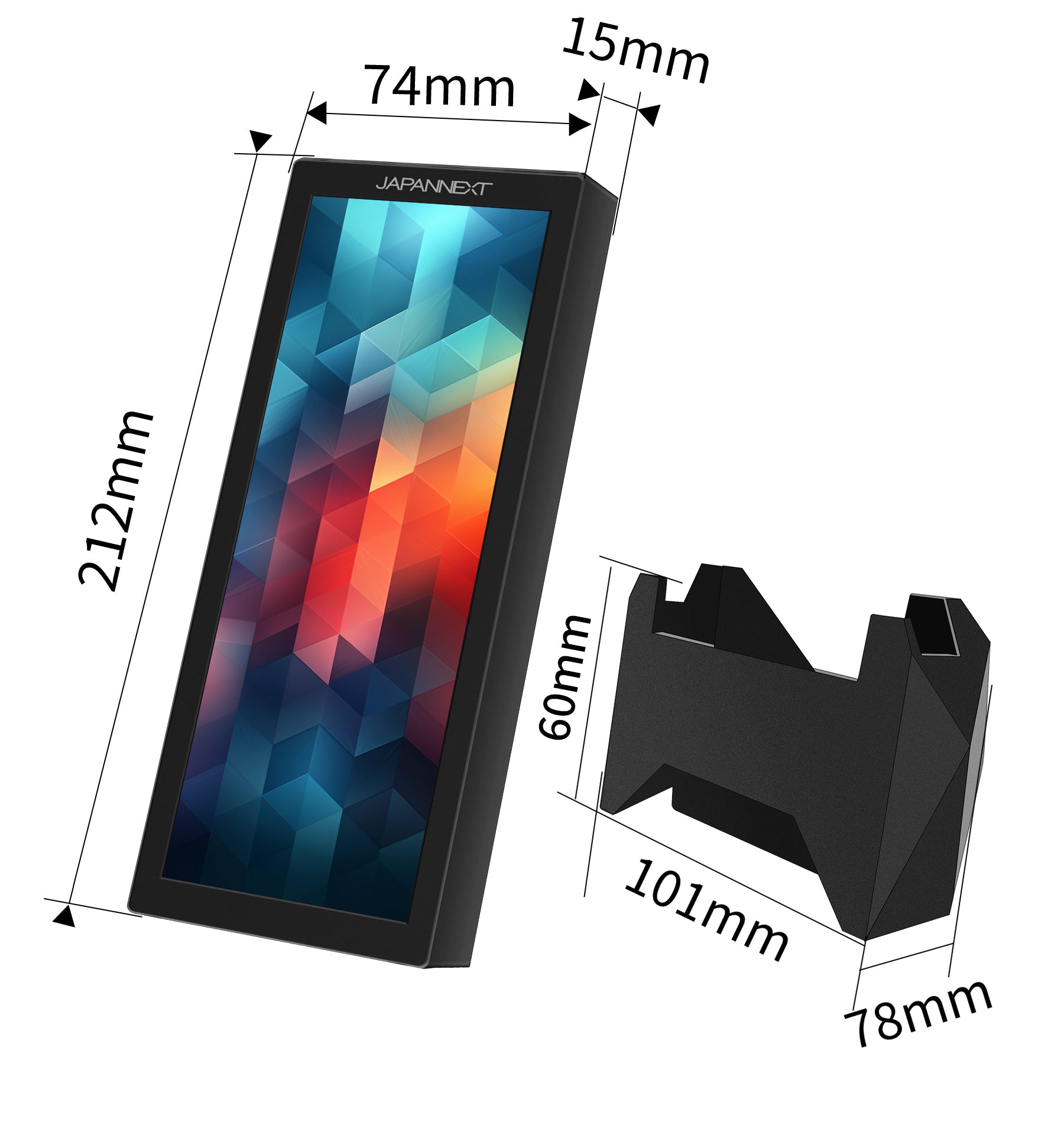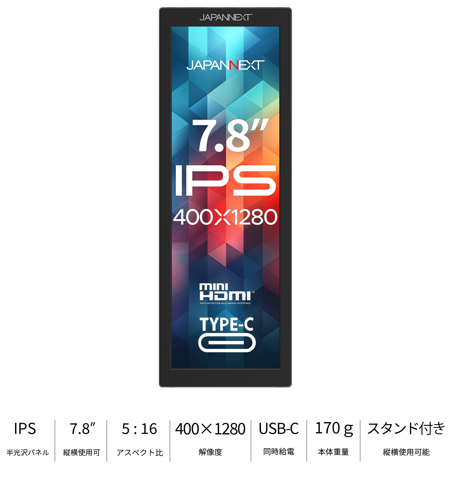 7.8インチのIPSパネルを搭載したモバイルモニターです。解像度400×1280の縦型小型ディスプレイで、優れた携帯性を備えており、専用スタンドを使用することでデスク上でも場所を取らずに設置が可能です。