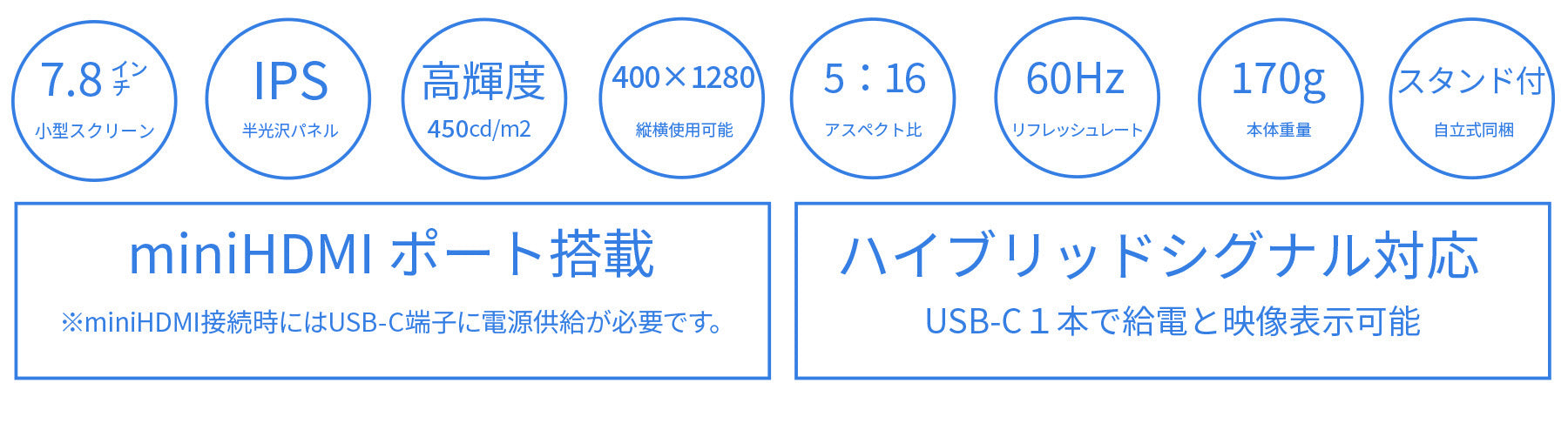 インターフェイスはUSB Type-C (ハイブリッド) x1、miniHDMI x1を装備します。*miniHDMI接続時にはUSB-C端子からの電源供給が別途必要になります。
