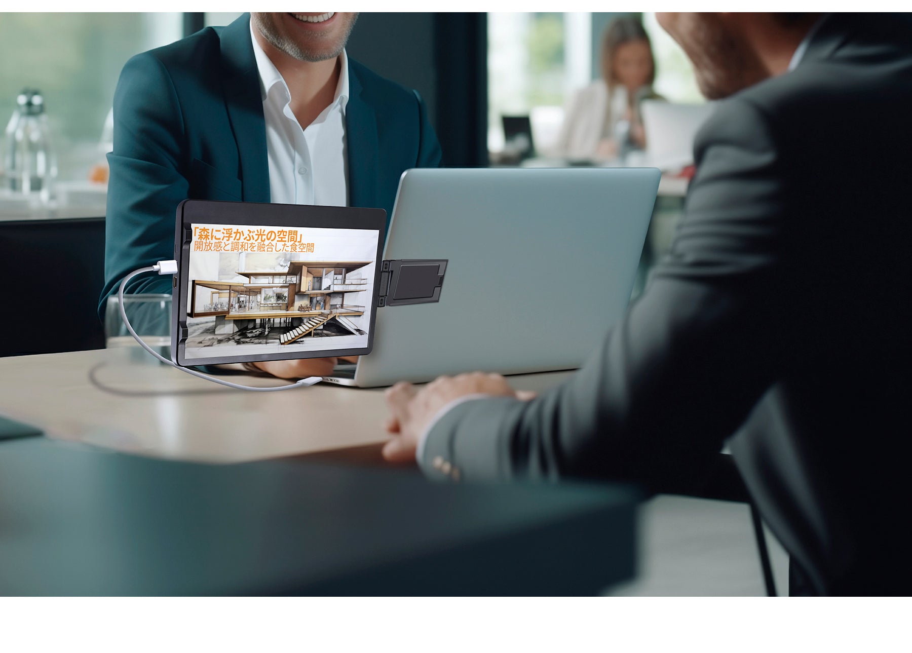 サイズは11.6インチ(解像度1366x768)でノートPCの背面に取り付け(ステッカー使用)が可能で、ご自身のサブモニターとしても使用できる他、対面のお客様に資料を見せる際などには装着したままで画面を反転する事が出来、その際に画面の上下は自動的に反転表示されます。*取付可能なノートPCの幅を事前にご確認ください。またモバイルモニターよりも軽量なノートPCでは画面角度によってバランスが保てず安定して使用が出来ません。