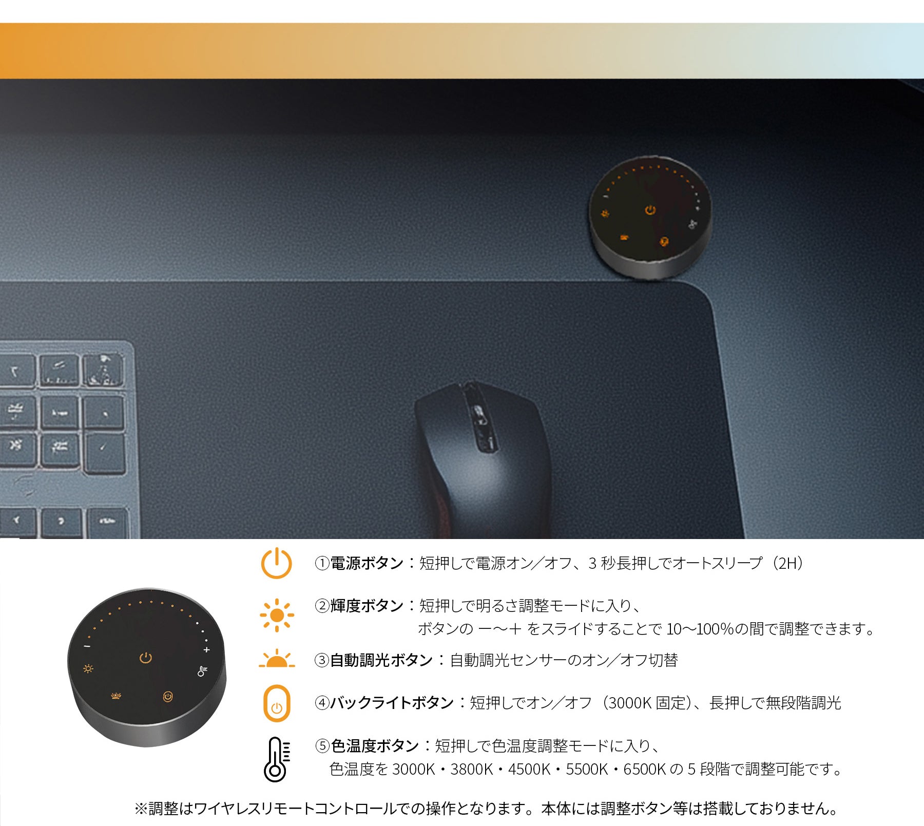 ワイヤレスリモコンを同梱し、手元から明るさや色温度を簡単に操作できます。ケーブル不要のワイヤレス仕様で、デスク周りもすっきり保てます。